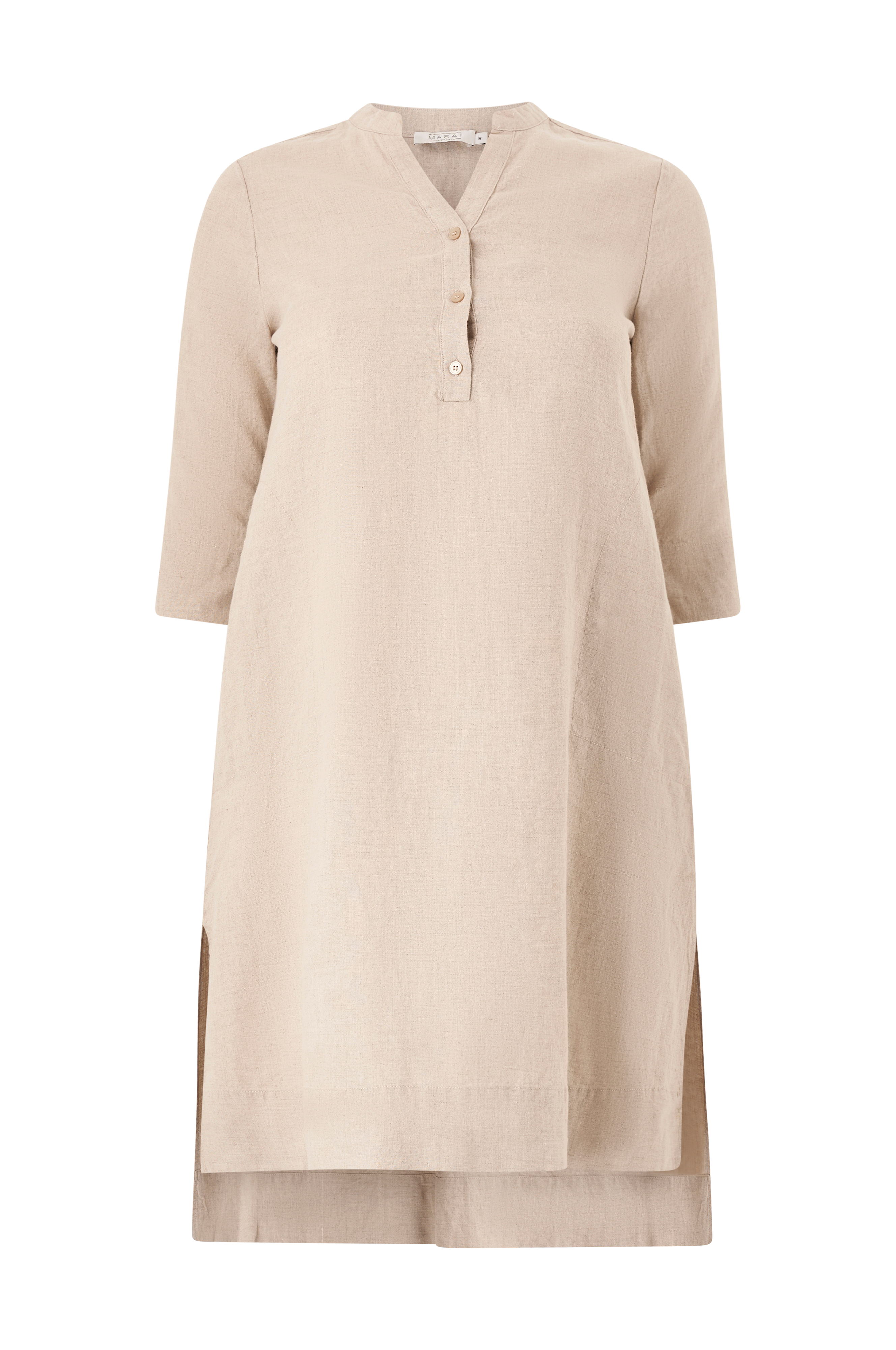 • Klänning i linne• V-ringning med knappar• 3/4-långa ärmar med sprund i ärmsluten• Fickor• Slitsar i sidorna• Lös passform• Något längre baktill• Längd: 110 cm i storlek S