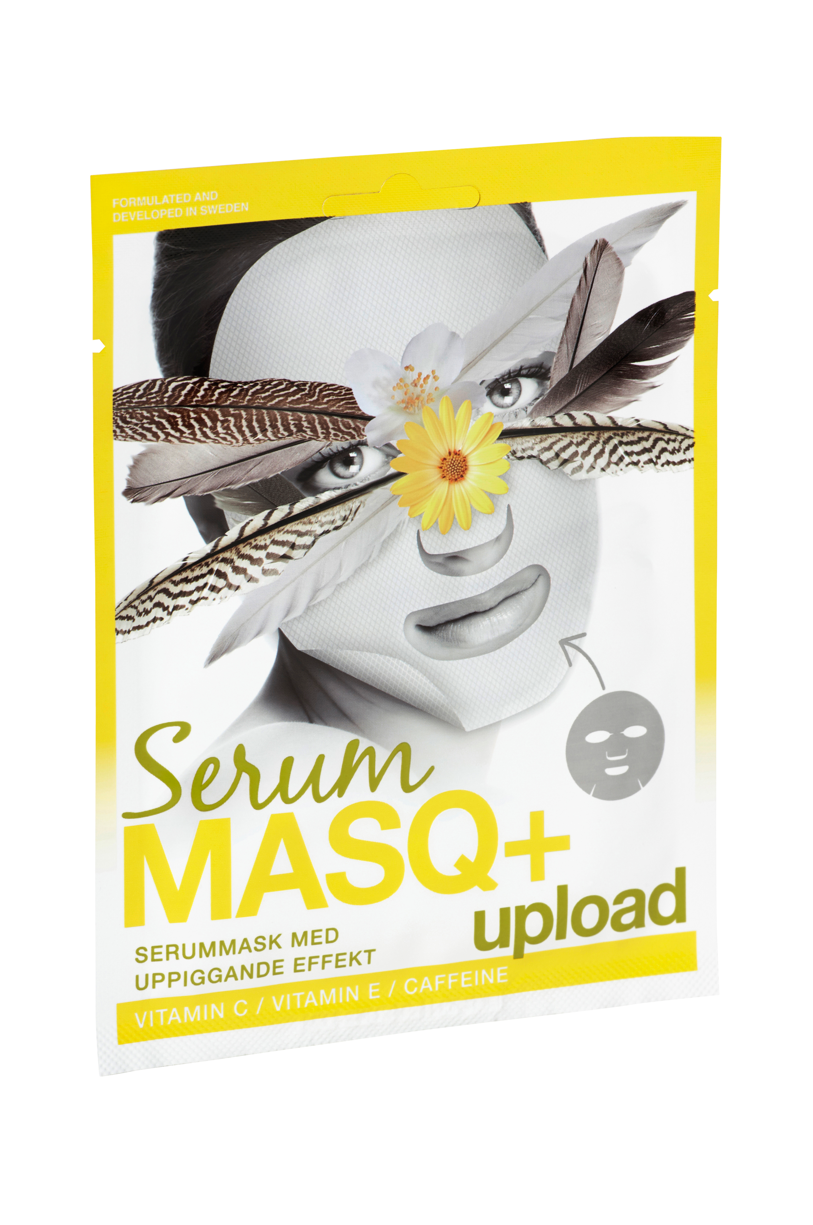 SerumMasq+ upload ger en riktig vitaminkick när din hy känns trött och saknar spänst. Den skräddarsydda ansiktsmasken innehåller ett aktivt serum som mättar huden med uppiggande och energirika ingredienser från vitamin C, vitamin E och caffeine. Placera den bara över ansiktet, luta dig tillbaka. Regelbunden användning av SerumMasq+, 2 3 gånger i veckan, håller din hy återfuktad, ger en fin lyster samt hjälper till att förebygga åldrande. SerumMASQ+ är en skräddarsydd cellulosa mask (sheet mask) som innehåller 23ml aktivt serum. Användning: Rengör ansiktet och torka det lätt med en handduk. Lägg masken över ansiktet. Låt verka ca 15-20 min. Ta av masken och massera in kvarvarande serum. Tips: Använd serumet som ligger kvar i förpackningen till att smörja in hals och dekolletage. Släng inte masken direkt efter användning utan ta masken och smörj in det sista serumet på armar och ben. På så vis tar du tillvara på alla viktiga serumdroppar. INGREDIENTS: aqua, glycerin, dipropylene glycol, butylene glycol, sodium hyaluronate, hamamelis virginiana (witch hazel), arginine, carbomer, peg-60 hydrogenated castor oil, betaine, allantoin, zanthoxylum piperitum, pulsatilla koreana, usnea barbata, disodium EDTA, hydroxyethylcellulose, caffeine, dipotassium glycyrrhizate, sodium ascorbyl phosphate, hydrolyzed collagen, rosa centifolia, aloe barbadensis, tocopheryl acetate, olea europaea (olive), citrus grandis (grapefruit) oil.