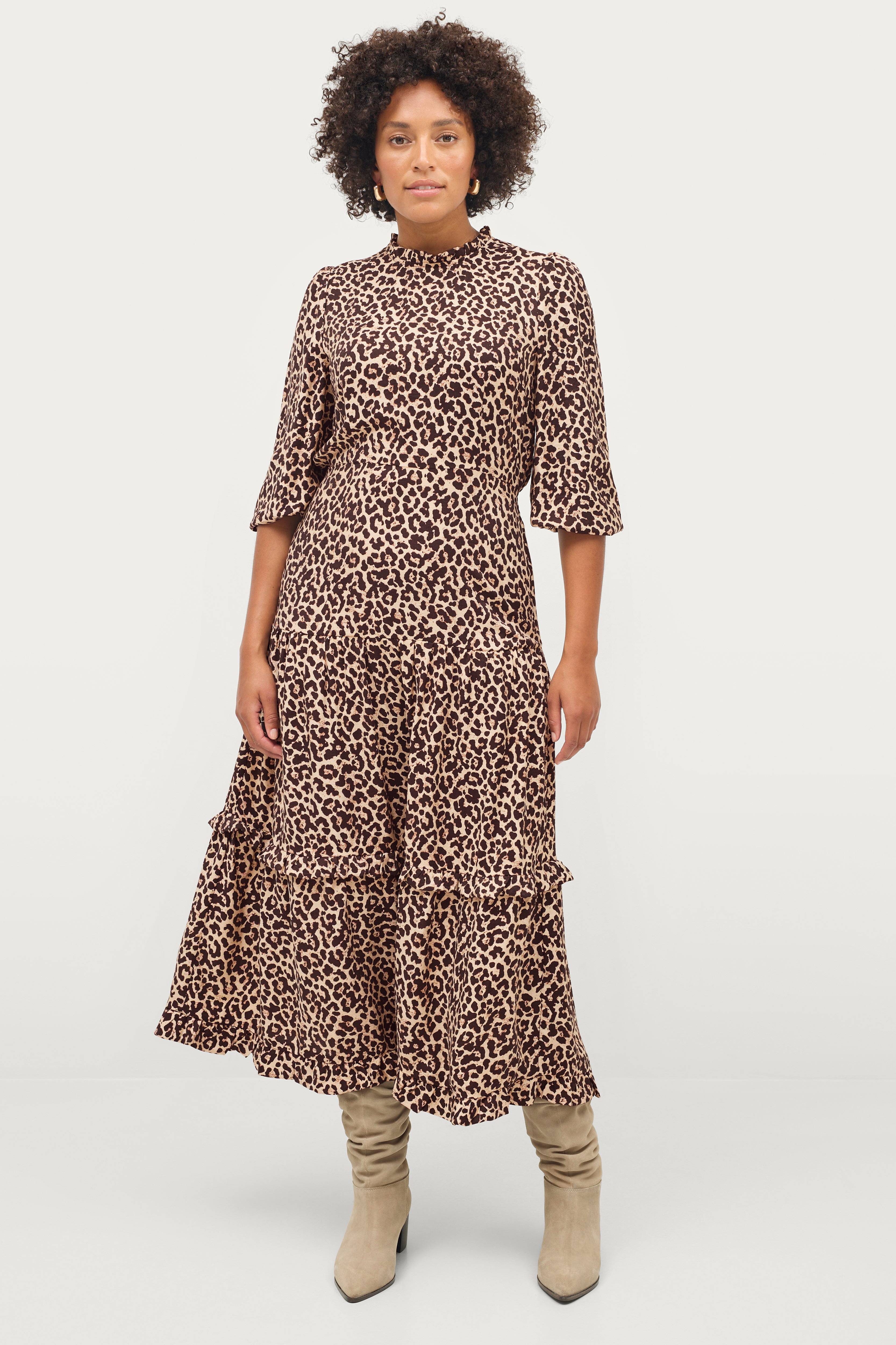 • Figurformad modell• Markerad midja med resårsömmar bak• Liten volang i halsen med knapp i nacken• Rak, 3/4-lång puffärm med resår i ärmsluten• Utsvängd kjol med volanger• Längd: 136 cm i storlek S