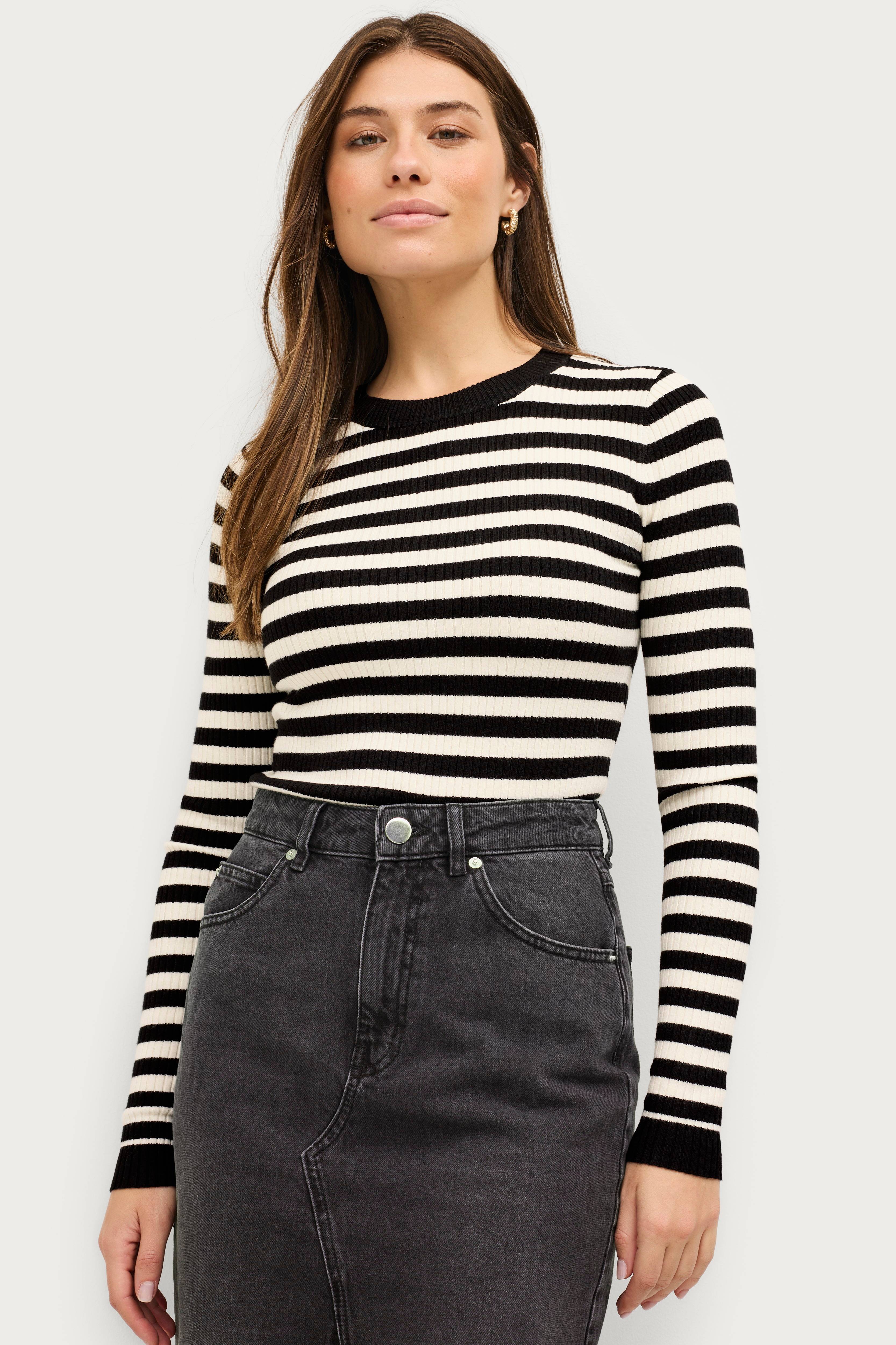 • Figurnära modell med stickade ränder• Ribbad rund hals