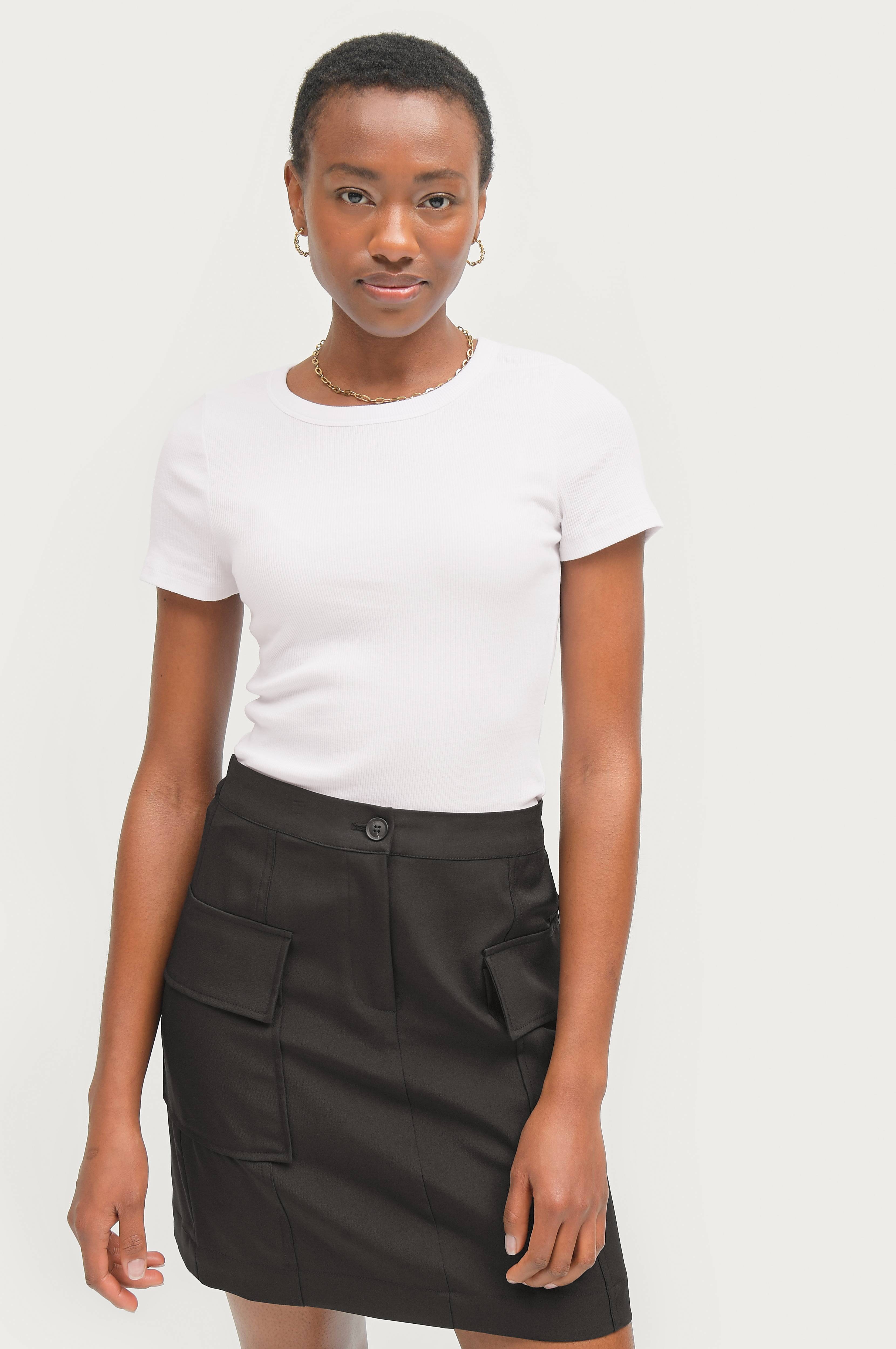 • Gjord av ribbad, stretchig trikå• Rund halsringning• Kort ärm