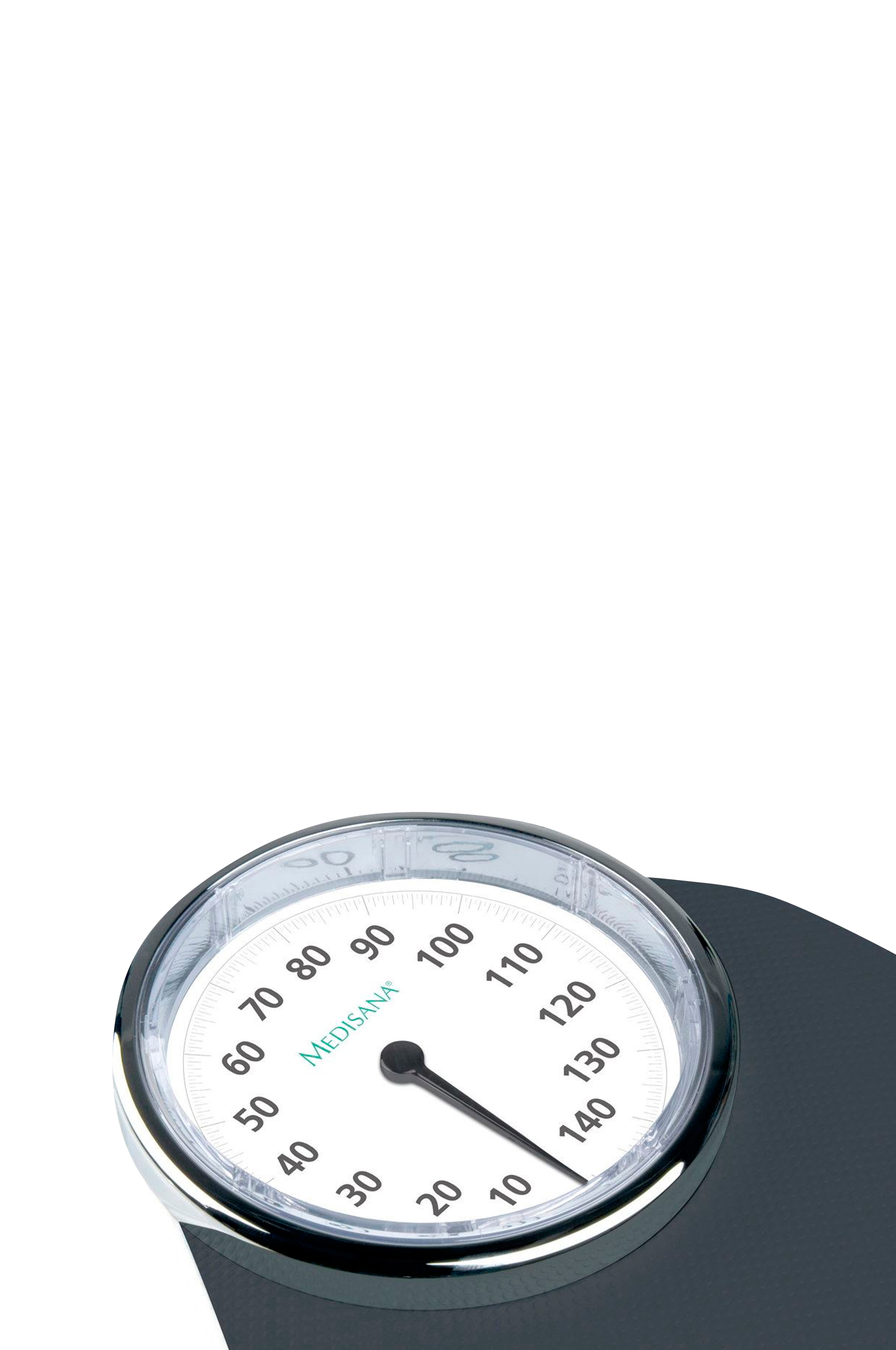 Medisana PSD är en analog personvåg i retrodesign, helt mekanisk och utan batterier. Den klarar en maxvikt på 150 kg, och vikten visas i steg om 500 g.