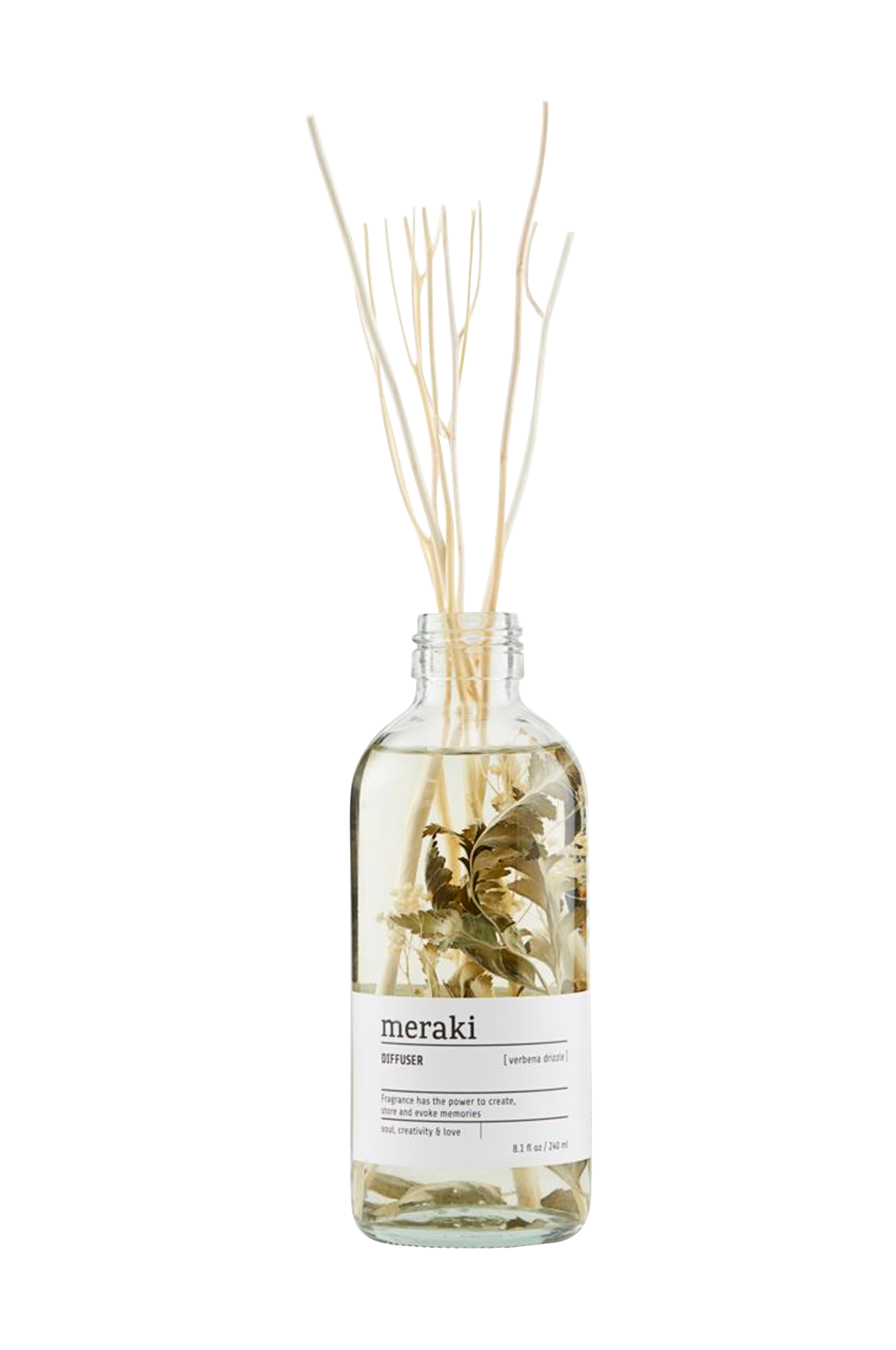 Sprid en underbar och lugnande doft i hemmet med Merakis doftpinnar Verbena Drizzle. De små doftpinnarna i trä kommer i en enkel flaska och pinnarna sprider en underbar doft i ditt hem. Använd doftpinnarna i ditt badrum och placera dem på en bricka eller i kombination med andra dekorativa element för att skapa ett snyggt stilleben.