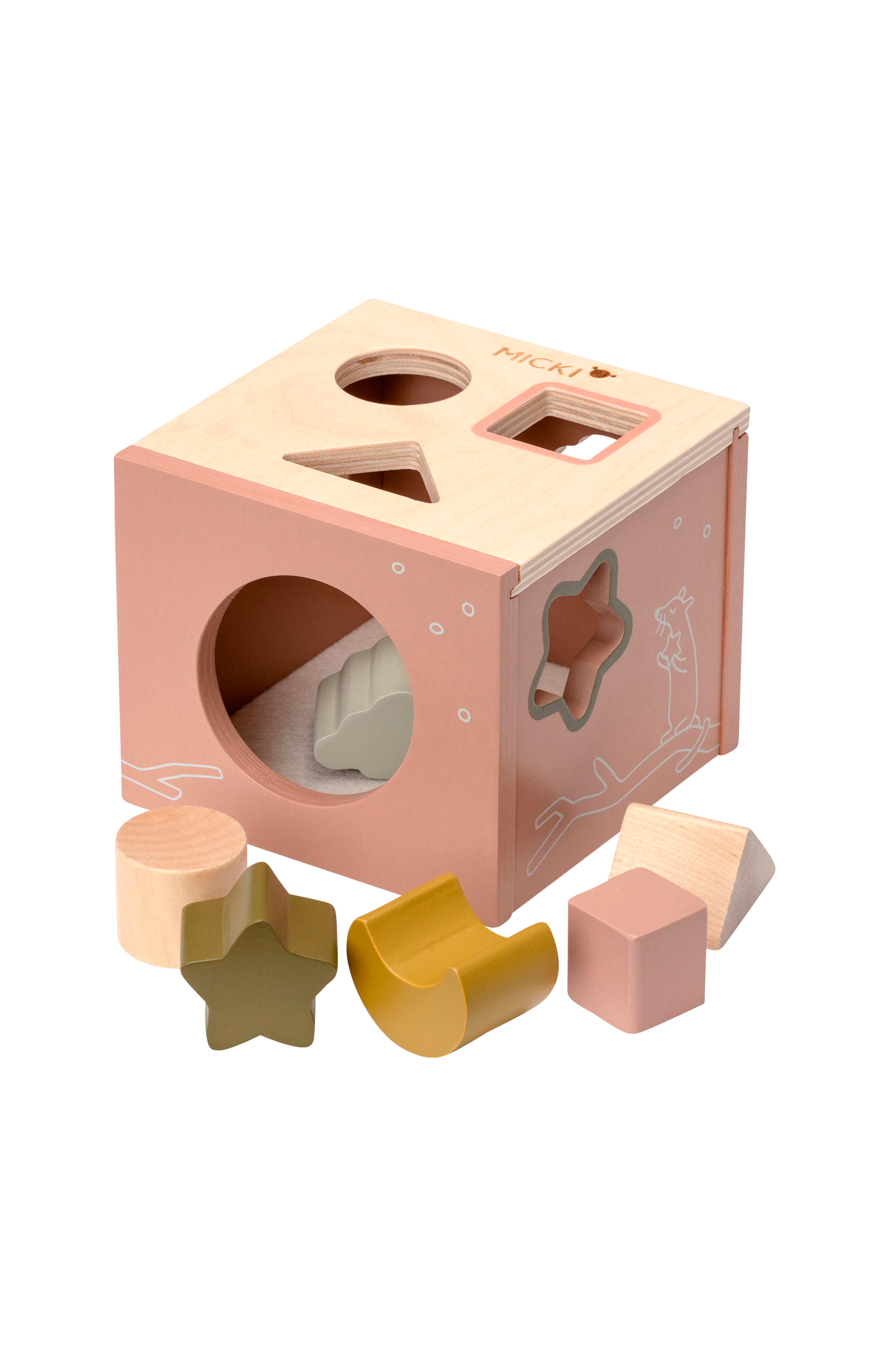 Plocklåda.Mickis klassiska plocklåda i trä inspirerar både till lärande och rolig lek. Träleksakens hål matchar träklossarnas form och färg så barnet vet vilka klossar som passar. När klossarna är i lådan är det bara att sticka in handen i hålet för att ta ut dem och börja om igen! Botten av lådan är klädd med filt för att ge ett behagligt ljud när klossarna släpps ner. Plocklådan innehåller sex träklossar i olika former.
