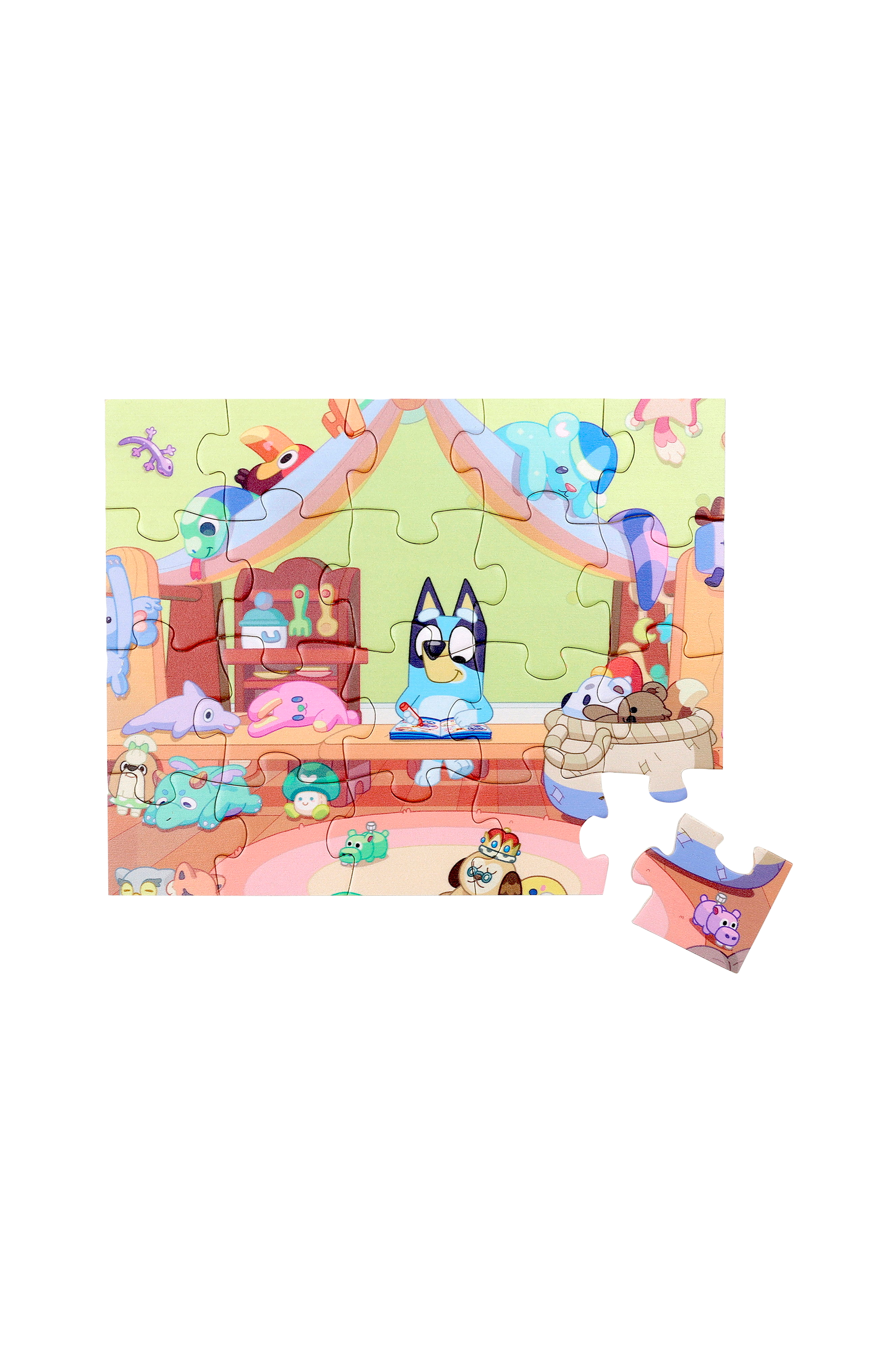 Ett roligt Blueypussel med illustration på Bluey när hon sitter och ritar hemma i sitt rum!