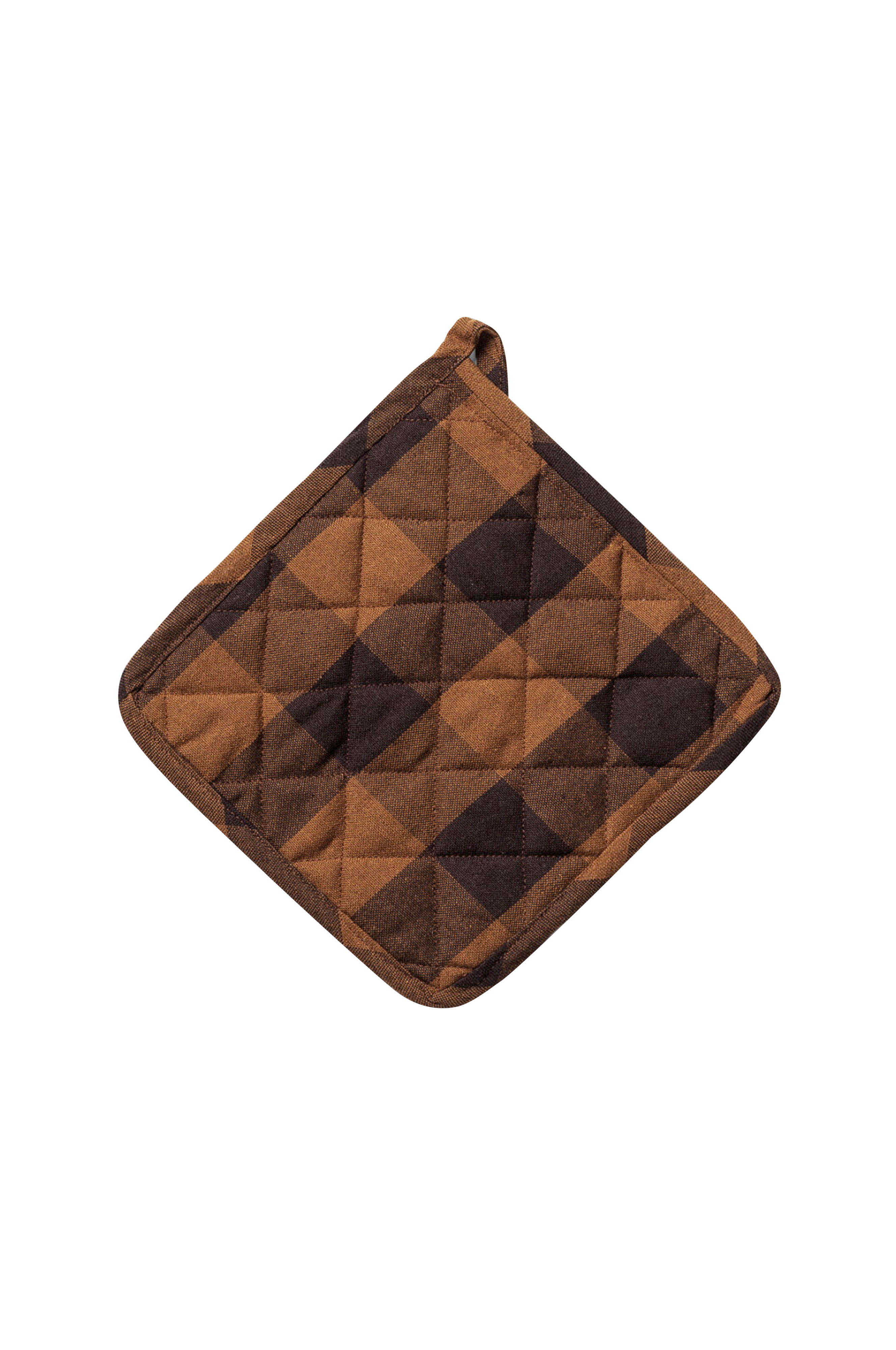 Grytlapp i återvunnen bomull. Det gingham -mönstrade tyget är tillverkat av återvunnet bomullsgarn som framställts av avfallsprodukter från den indiska textilindustrin.