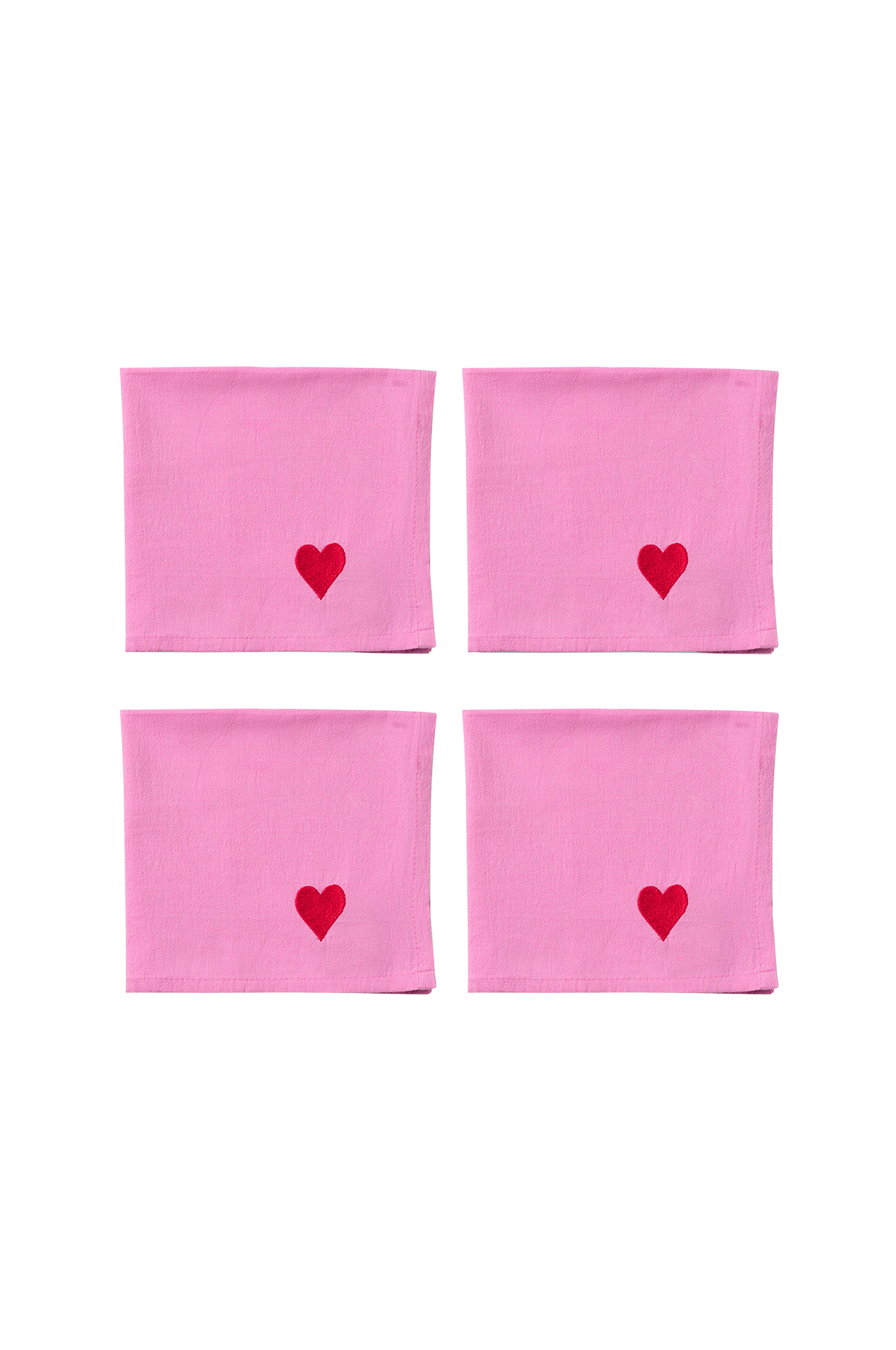 Servetterna kommer i en uppsättning om fyra. Varje servett har ett ljusrött hjärta broderat på sig. Färgen på tyget är ljusrosa och storleken är 40×40 cm. Servetterna är GOTS-certifierade och tillverkade i 100 % ekologisk bomull. Tvätta i max 60 grader.