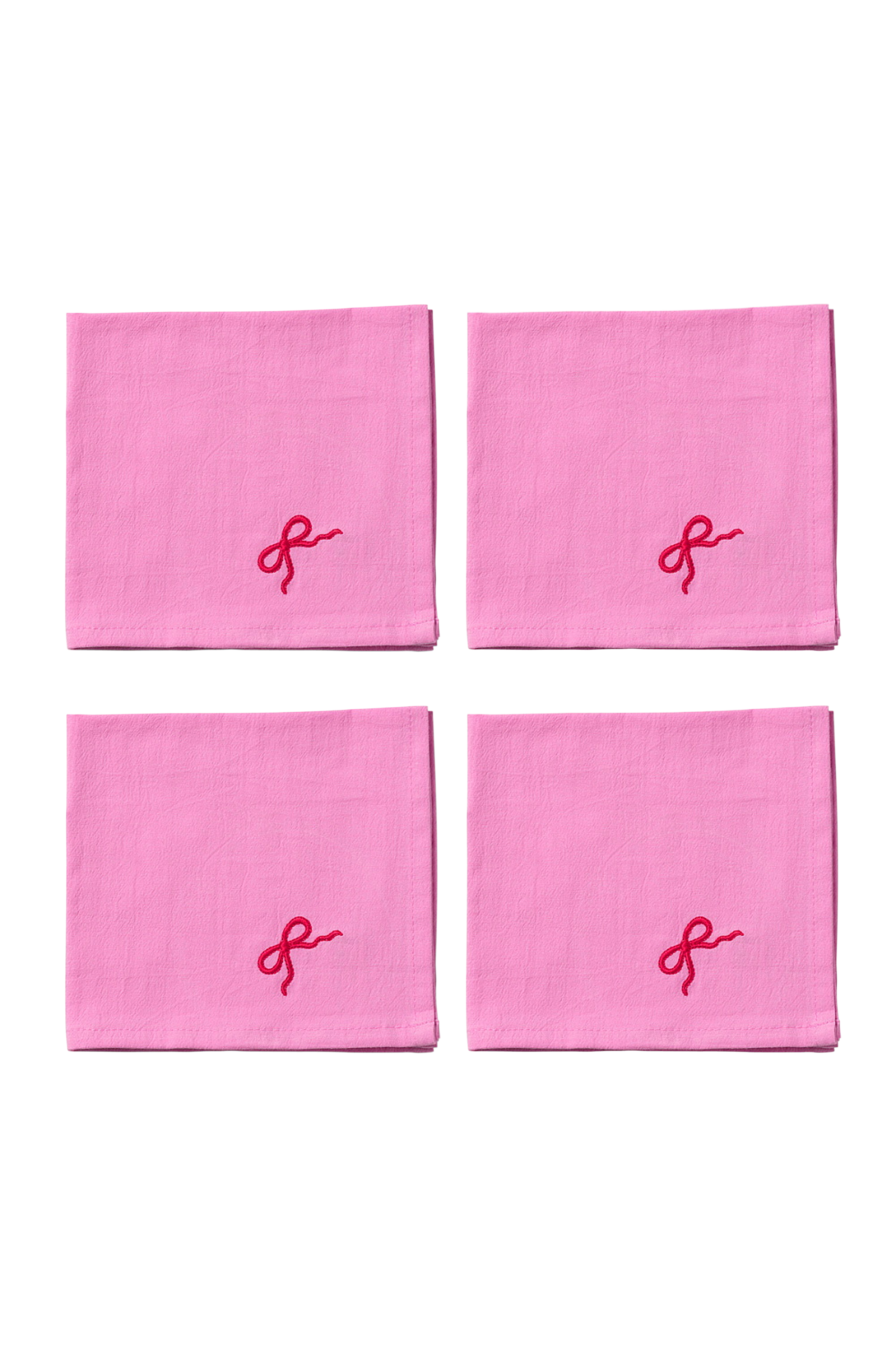 Servetterna kommer i en uppsättning om fyra. Varje servett har en röd rosett broderad på sig. Färgen på tyget är ljusrosa och storleken är 40×40 cm. Servetterna är GOTS-certifierade och tillverkade i 100 % ekologisk bomull. Tvätta i max 60 grader.
