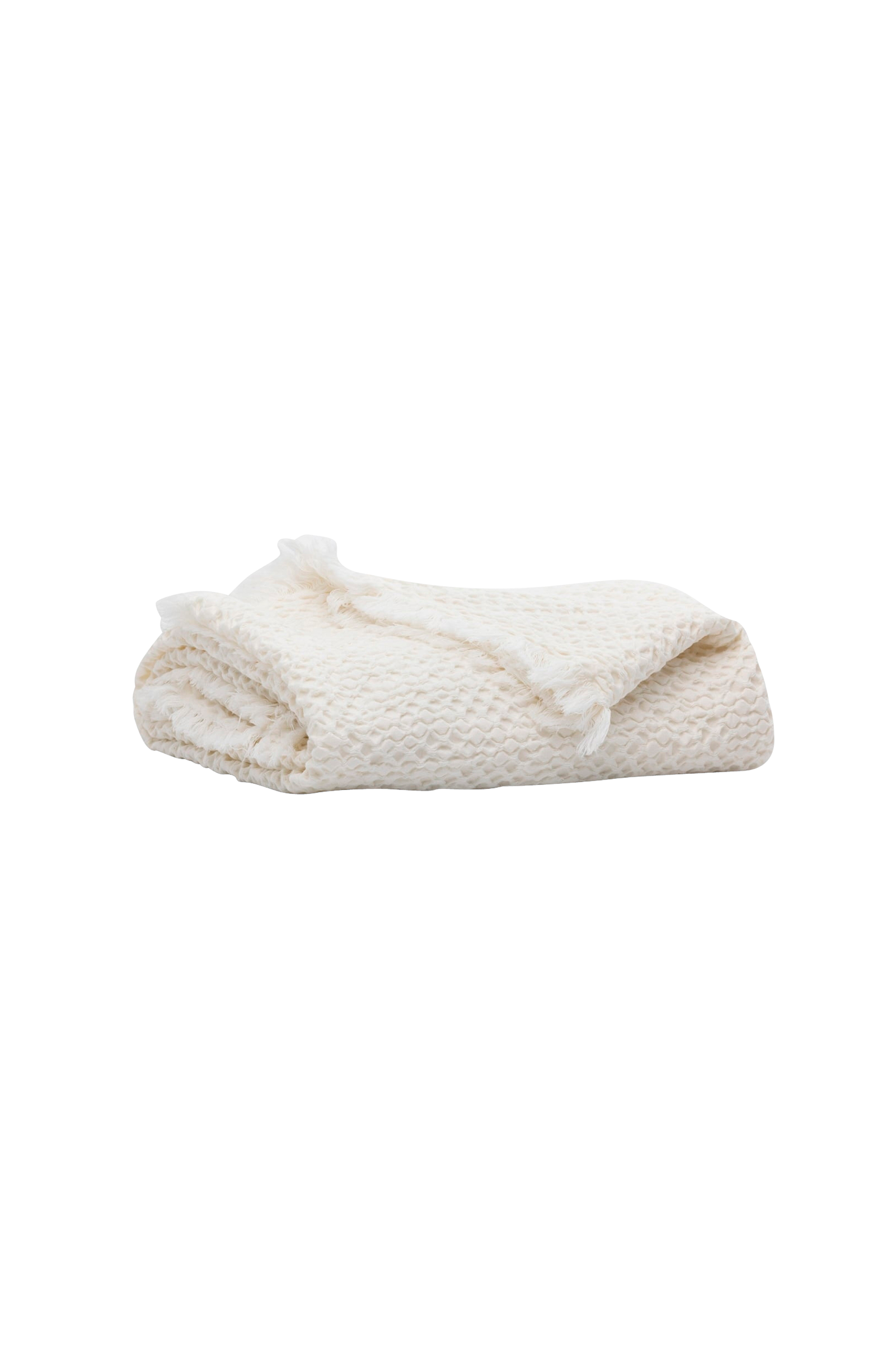 Dekorativ och stilren pläd i 100% stentvättad bomull. Designad med våffelstruktur och dekorativa fransar längs alla fyra sidor. Känslan är mjuk och följsam och smälter sömlöst in oavsett om den pryder sängen, soffkanten eller uteplatsen. Ett naturligt tillskott till alla hem. Tillverkad i Portugal. Standard 100 av oeko-tex®.