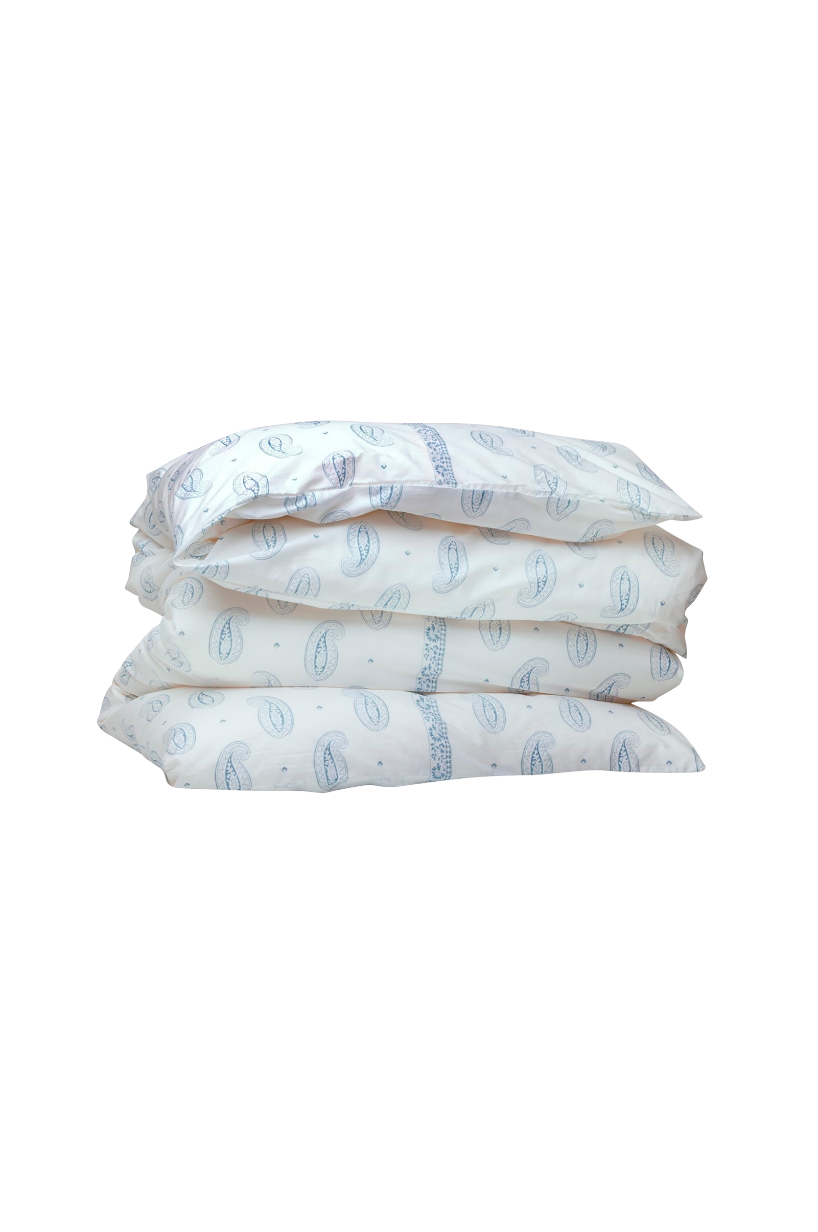 Påslakan i slät och krispig percale, tillverkad av kammad bomull. Trådantal: 300 tc. Tidlöst och klassiskt paisleymönster i blått på vit botten. Designad med 3 cm breda dekorativa bårder 35 cm från kanterna. Stängs med knappar.