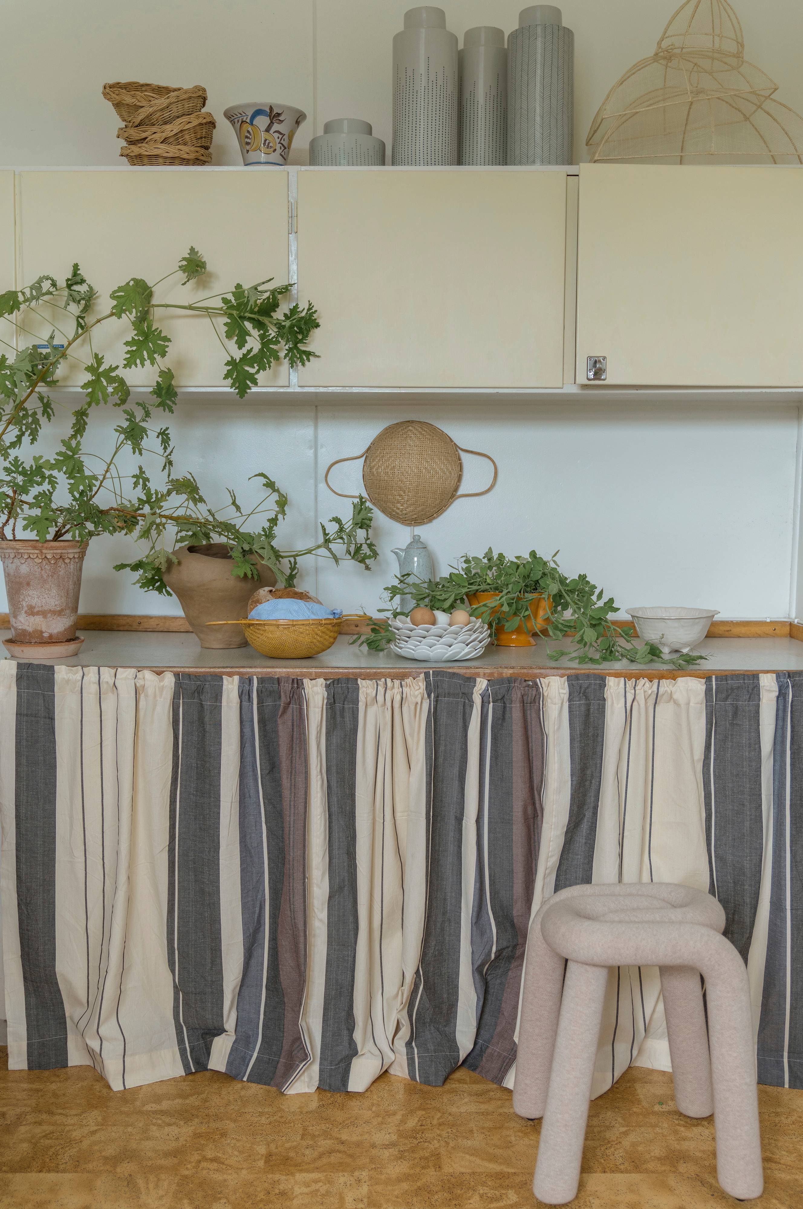 Extra bred Bistro-gardin i handvävt randigt bomullstyg. Gardinen är skräddarsydd med en ficka som passar en liten gardinstång och har en liten rynka upptill. Gardinen är tillverkad av 3 st handvävda tygstycken som är sammanfogade, har råa kanter och en dubbelvikning nedtill. Fållen nedtill har även en öppning på varje sida så att gardinen kan användas som spänngardin i fönster, på dörrar eller skåp. Tyget är vävt för hand och kommer att ha ojämnheter i både tjocklek, trådar och färg.