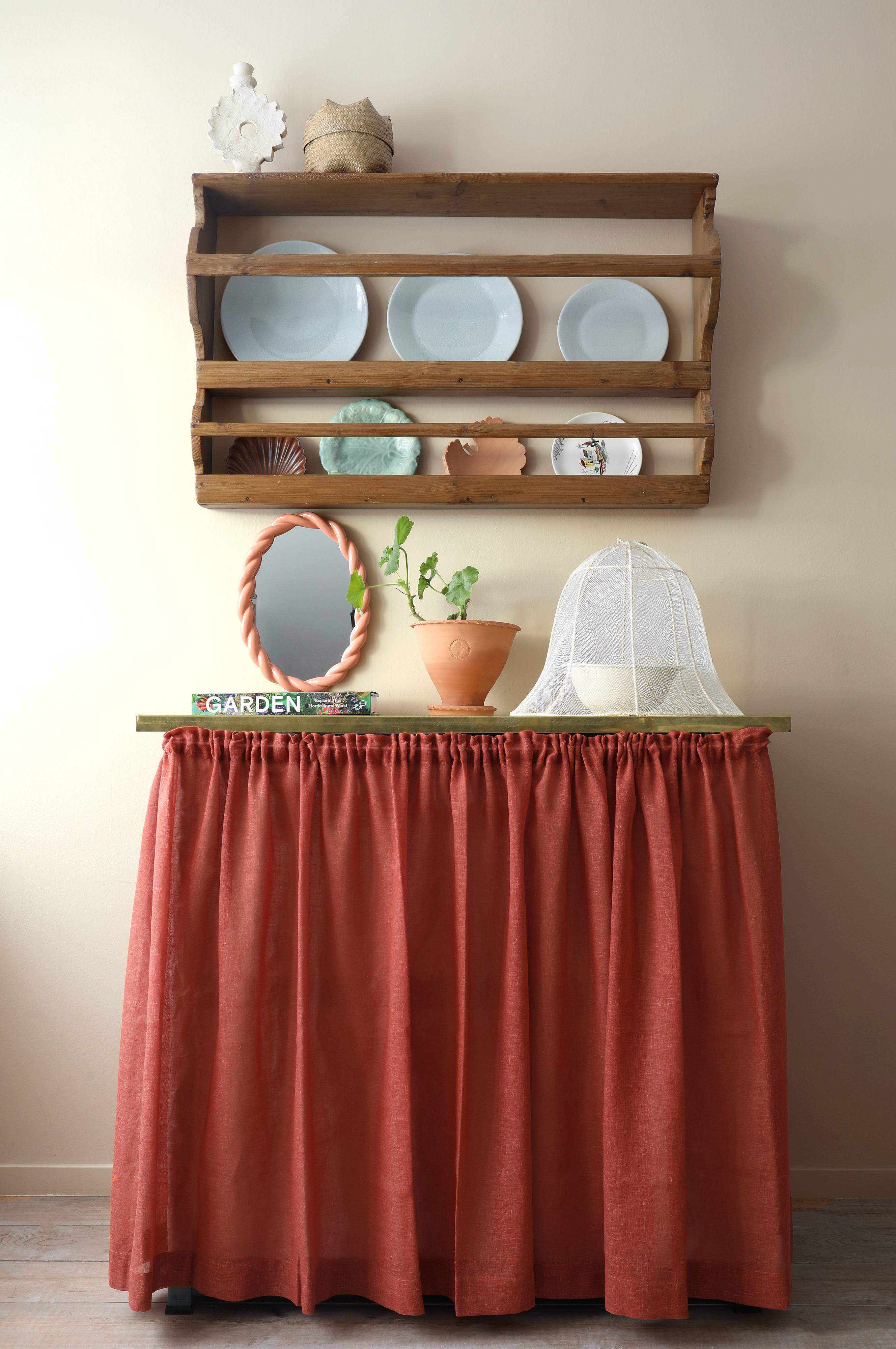 Extra bred cafégardin i skir halvlinne med vacker struktur. Gardinen är sydd med kanal som passar en tunn gardinstång eller gardinspiral och har ett litet rynkhuvud upptill. Bistrogardinen har ett skräddat uttryck med klassiska osynliga sidofållar och dubbelt upplägg nedtill så att gardinen får rätt tyngd. Fållen nedtill har även en öppning i varje sida så att gardinen även kan användas som en spänngardin i fönster, på dörr eller skåp. Tyget är Oeko-Tex® Standard 100 certifierad, vilket är en garanti för att det inte innehåller hälsovådliga ämnen. 30 grader skonsam maskintvätt eller kemtvätt. Säljs styckvis.