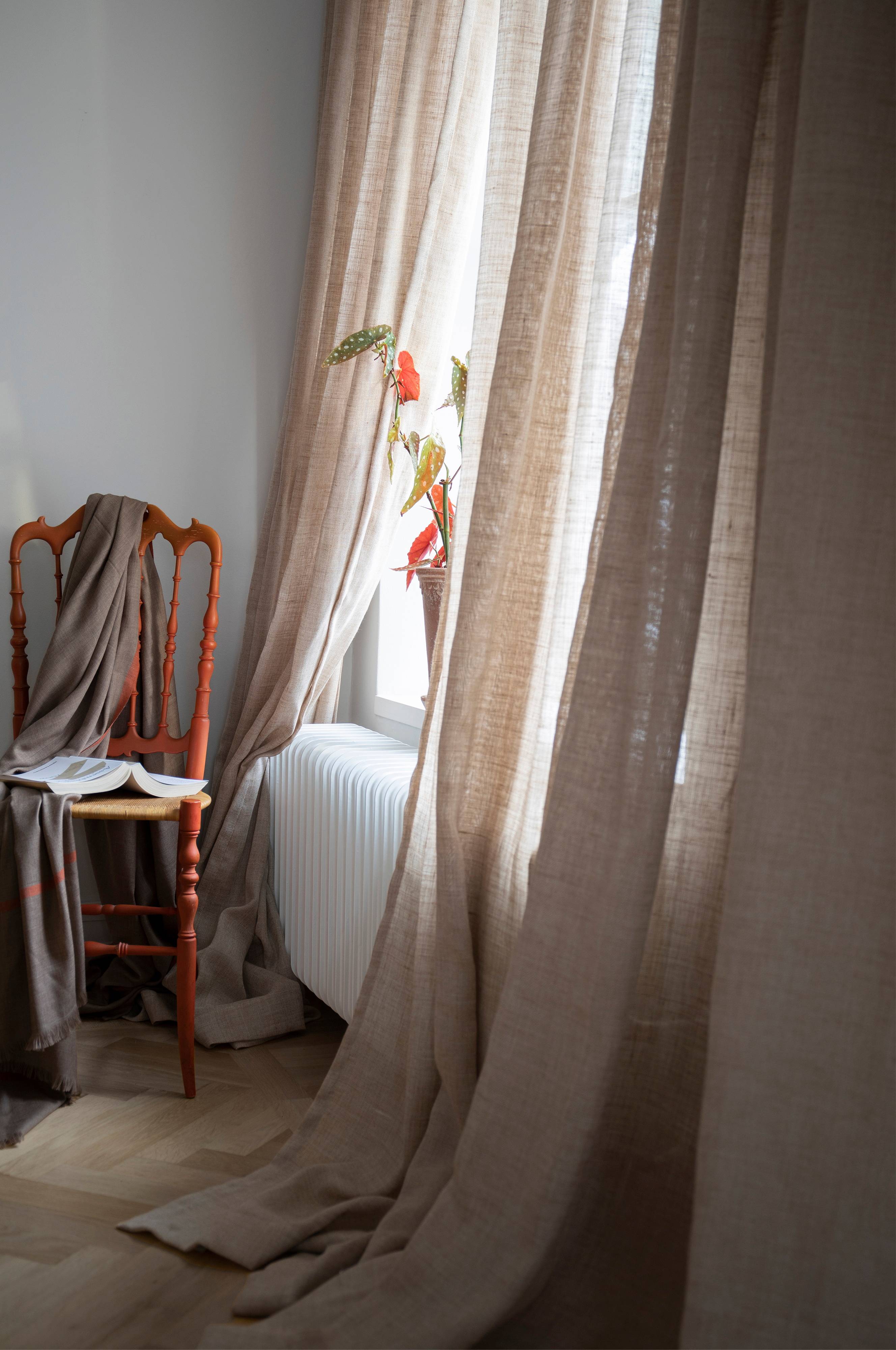 Tung linnegardin som är 295 cm bred vilket gör att den passar både i vanliga fönster och i stora fönsterpartier. Gardinen är vävd med kraftiga linnetrådar och återvunnen polyester. Lin är ett naturligt material som blir vackrare med tiden. Gardinen har ett skräddat uttryck med klassiska osynliga sidofållar och dubbelt upplägg nedtill så att gardinen får rätt tyngd. 4-fingerkrok ingår till varje veckbandslängd. Fingerkroks-upphäng passar alla skenor med glid och vanlig gardinstång med gardinring och ögla på. 4-fingerkrok används för att skapa vackra fingerveck i gardinen som ger ett välskräddat intryck och låter gardinen komma till sin rätt. Gardinens bredd utan fingerkrok: 295 cm Gardinens bredd upphängd med 4-fingerkrok: ca. 150 cm Till våra gardiner har vi valt att trä fingerkrok i veckbandets alla kanaler. Givetvis går det att kroka gardinen på annat sätt. 4-fingerkrok går även att använda som 2-fingerkrok genom att hoppa över de två yttersta krokarna. Då täcker gardinen ca 175 cm bred istället. Tyget är Oeko-Tex® Standard 100 certifierad, vilket är en garanti för att det inte innehåller hälsovådliga ämnen. 30 grader skonsam maskintvätt eller kemtvätt. Säljs styckvis. Höjd 250 cm, 270 cm eller 290 cm.
