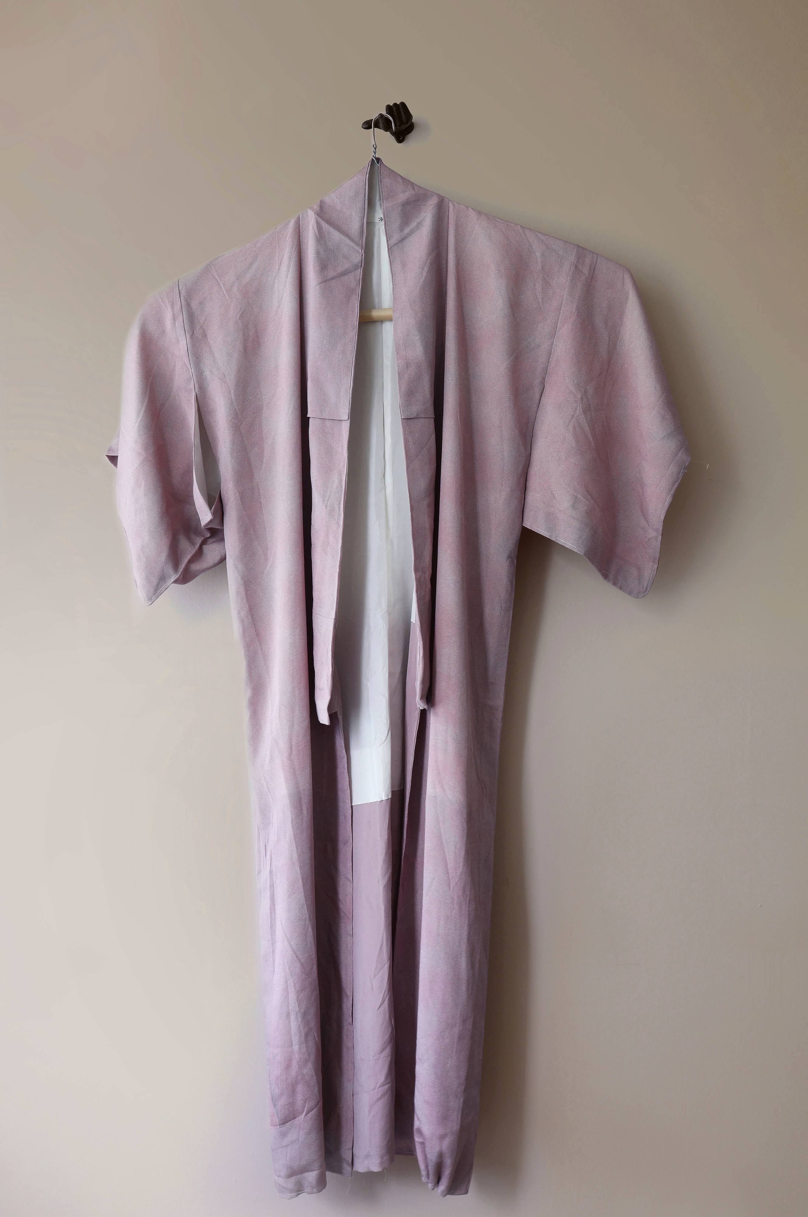 Vacker vintagekimono. Detta är ett vintageplagg som är handsytt och tidigare använt, därför kan mindre fläckar förekomma. Kimonon är utvald av ägarna till Mimou som rekvisita till deras fotograferingar. Varje kimono är unik och det finns endast en av varje modell. Denna kimono är vacker att hänga som dekoration eller att använda som klädesplagg. Fin som morgonrock eller styla den tillsammans med en t-shirt och ett par jeans. Den säljs utan skärp och de flesta kimonos är väldigt långa så vill man använda dem som klädesplagg så kan man lägga upp dem nedtill för att få rätt längd. Kuriosa är att kimono betyder "något man har på sig". Kimonon kommer packad i en fin väska. Längd ca 150 cm. Tvättråd: Kemtvätt