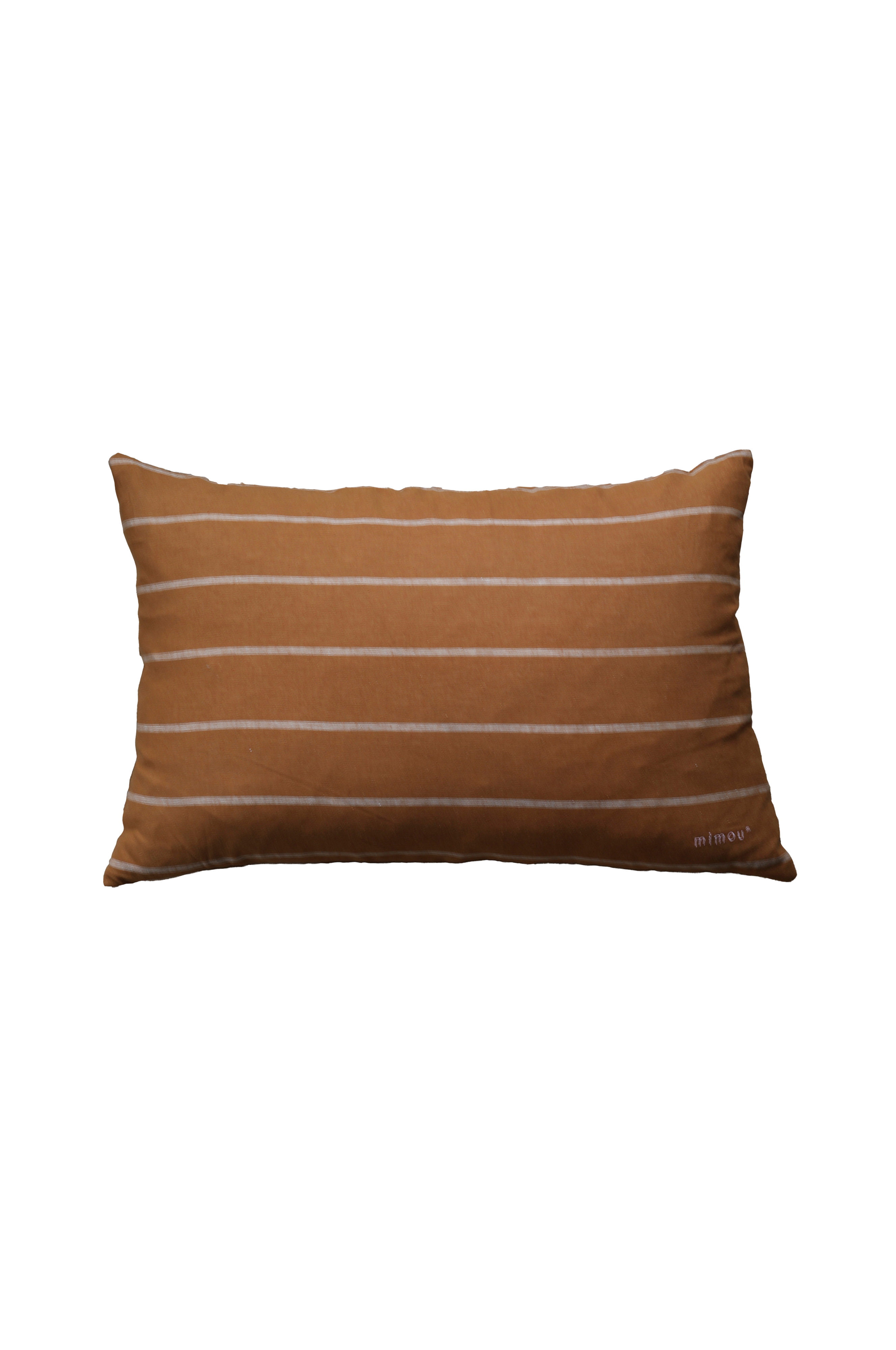 Randig bomullskudde som tillverkats av överskottstyg. Att återanvända material i stället för att nyproducera är ett hållbarare val och ett steg i att minska textilavfall. Kudden har samma vävda rand i vacker bränd ton på fram och baksida samt broderad mimoulogo i rosa på en av sidorna och dolt blixtlås. Säljs inklusive välfylld innerkudde av andfjäder. Storlek: 50X70 cm Material fodral: 100% bomull