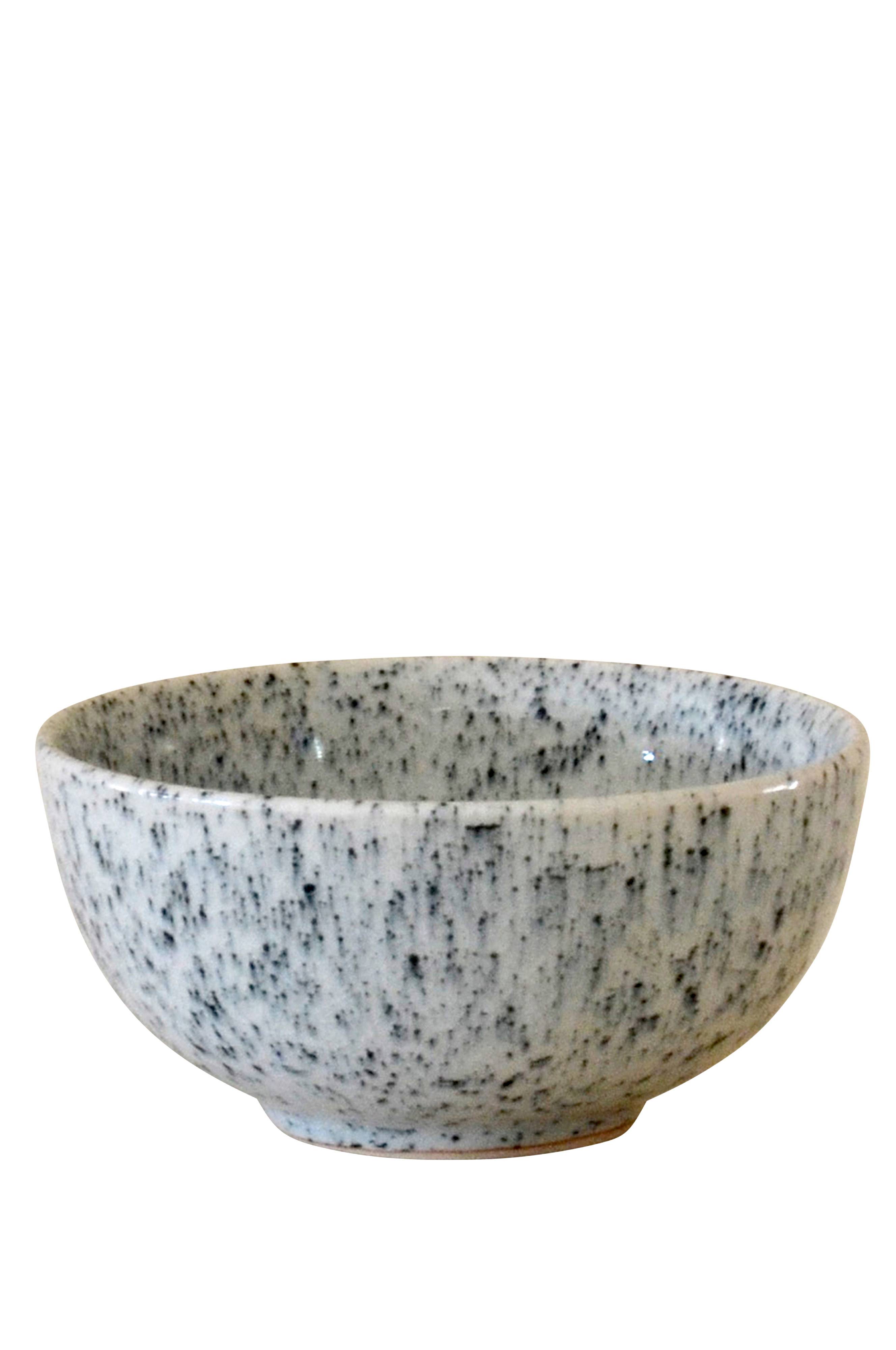 Liten skål i keramik som är gjuten för hand. Den är glaserad med celadonglasyr vars karakteristiska drag är dess fina krackeleringar, vackra färgskiftningar och hårda yta. Det blåa stänkmönstret varierar för de olika servisdelarna då stänkmålningen görs för hand. Storleken passar perfekt som frukostskål till både gröt och flingor, men är även utmärkt som servingsskål till oliver, jordnötter mm. Mimous keramik PURE är en serie servisdelar tillverkade i Lampang i norra Thailand. Området är känt för sin naturligt fina lera med hög kaolinhalt vilket gör keramiken väldigt tålig. Varje del gjuts i handgjorda formar och glaseras därefter i någon av Mimous glasyrer. PURE-servisen är tystlåten och har en utstrålning som man inte tröttnar på. Den kännetecknas av de nätta proportionerna som blir gedigna och stöttåliga på grund av den fina leran och de hårda glasyrerna. Tål mikrovågsugn och maskindisk. Storlek 12cm