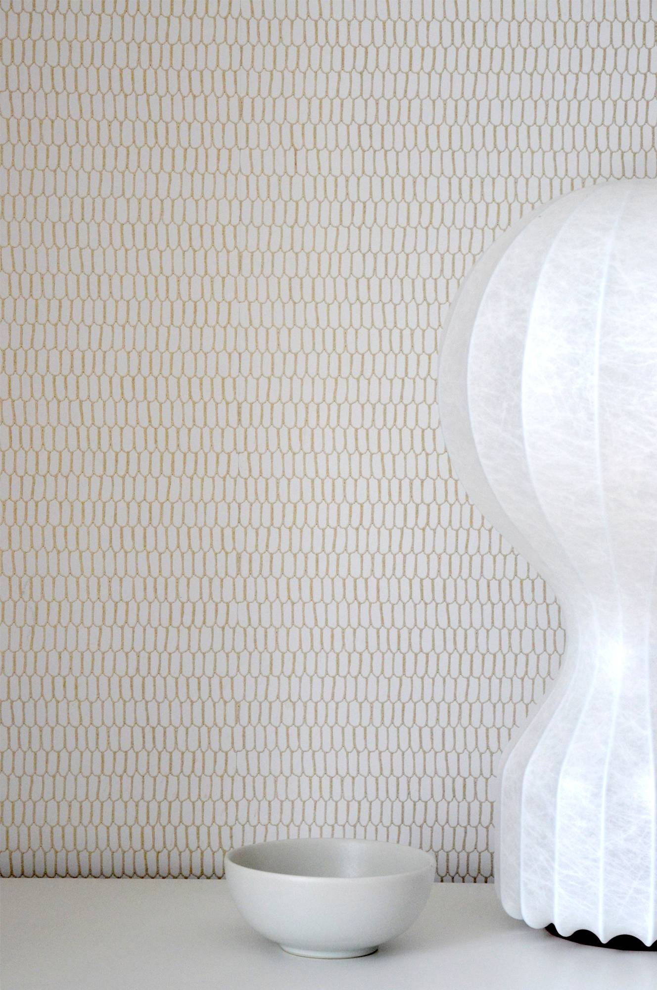 Grafiskt limtryckta små bågar i oregelbundna former. Tapeten Ginza ingår i Mimous tapetkollektion Artisan II som blev utnämnd till årets tapet i Sverige 2016 av tidningen Elle Decoration. Dimesionen på mönstret gör att den upplevs enfärgad när den sitter på väggen och lämpar sig likaväl att tapetsera alla väggar med som att göra en fondvägg. Oerhört fin att kombinera med tapet Strings eller Tweed om man vill göra en tvådelad vägg. Ginza är en non woventapet, vilket gör tapetseringen enklare genom att du stryker limmet direkt på väggen och sedan sätter upp tapeten. Ett vävlim skall användas, eftersom ett vanligt tapetlim är gjort för papptapeter. Här på Ellos kan du köpa ett perfekt matchande vävlim. Tillverkad i Sverige. Mönsterrapport: 53 cm. Varje rulle är 10,05 m. Bredd 53 cm.