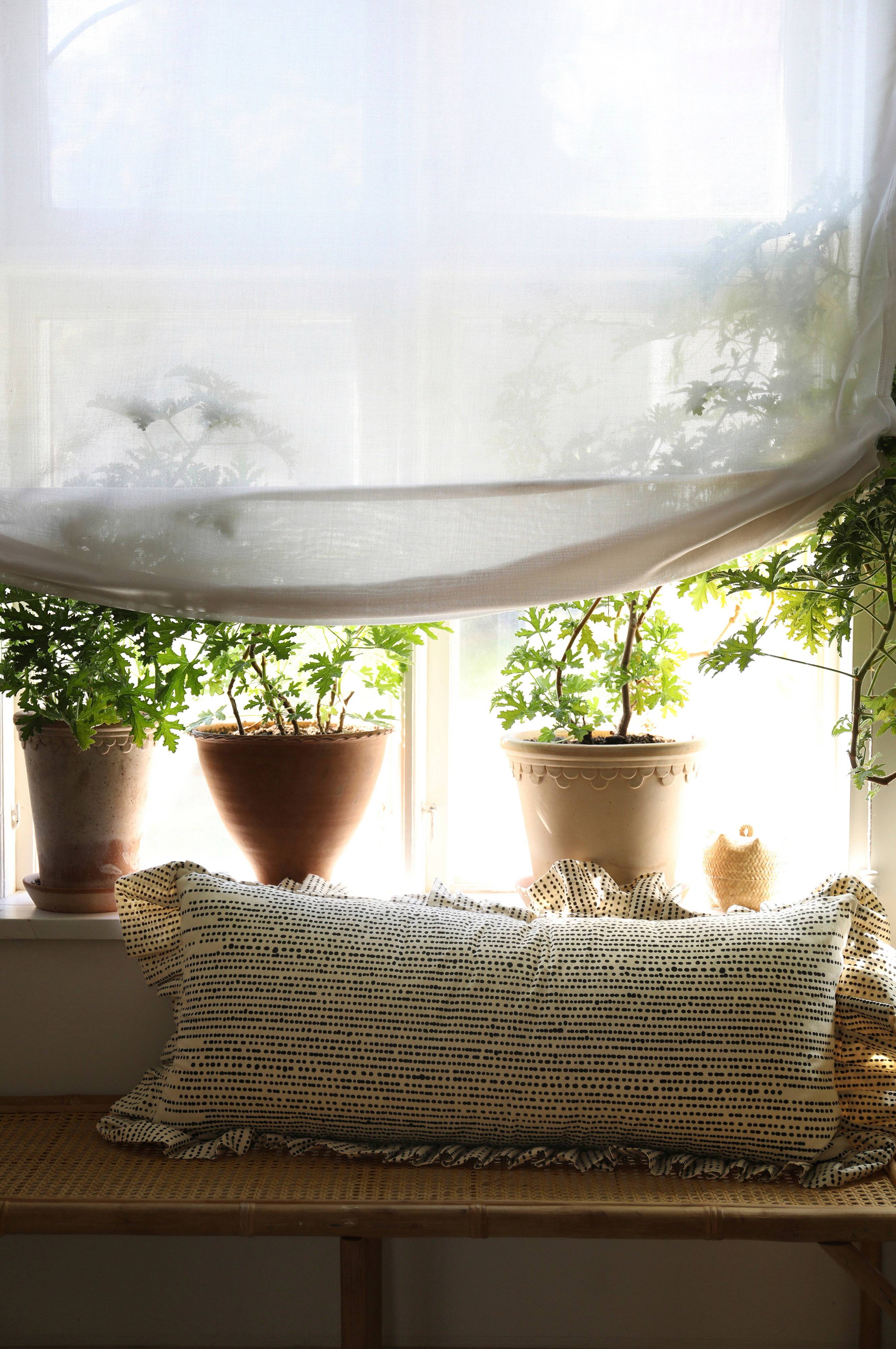 Handgjord kudde med volang i dubbla lager, tillverkad av handtryckt och handvävt bomullstyg. Säljs inklusive en Oeko-Tex®-certifierad innerkudde gjord av ankfjäder som blandats med för att göra den fastare. Storlek: 50X90 cm + 7 cm volang. Bomull.