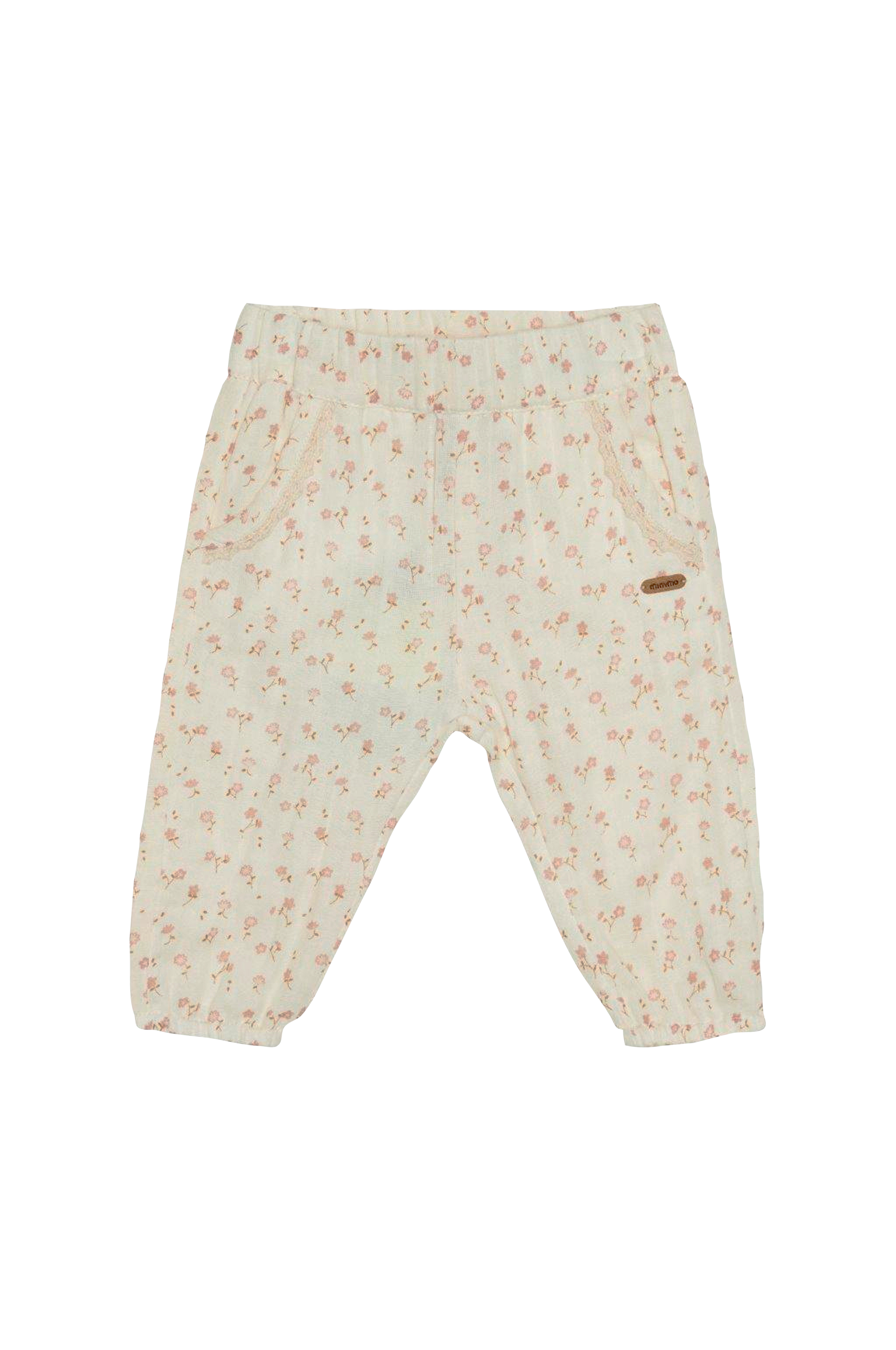 Byxor i vävd, mjuk bomullskvalitet med tryckt blommönster. Elastisk midja. Två fickor fram med spetskanter. Resår i ärmsluten.