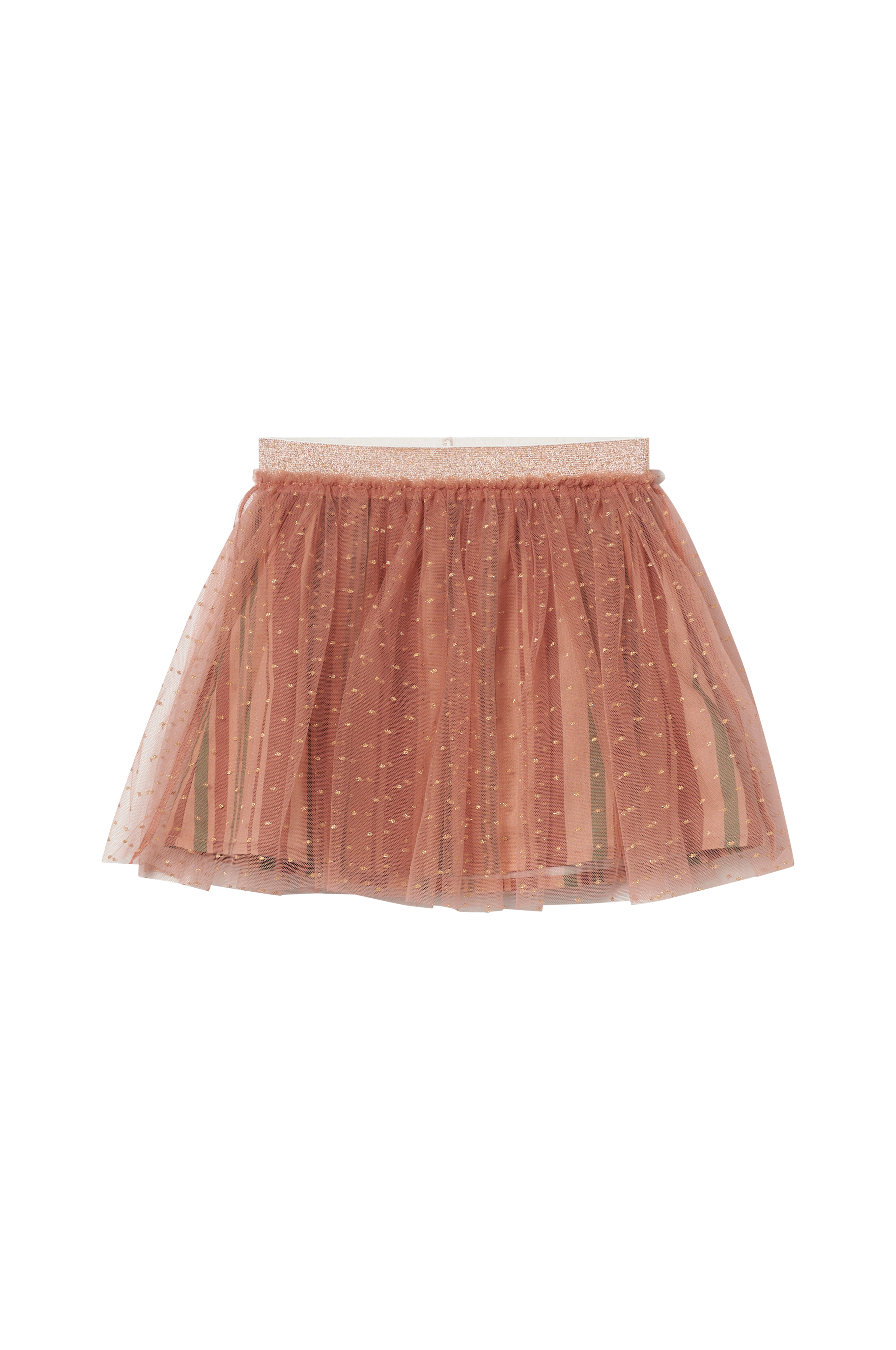 • Kjol i tyll med guldglittriga, tryckta prickar• Randig underkjol• Guldglittrig resårmidja