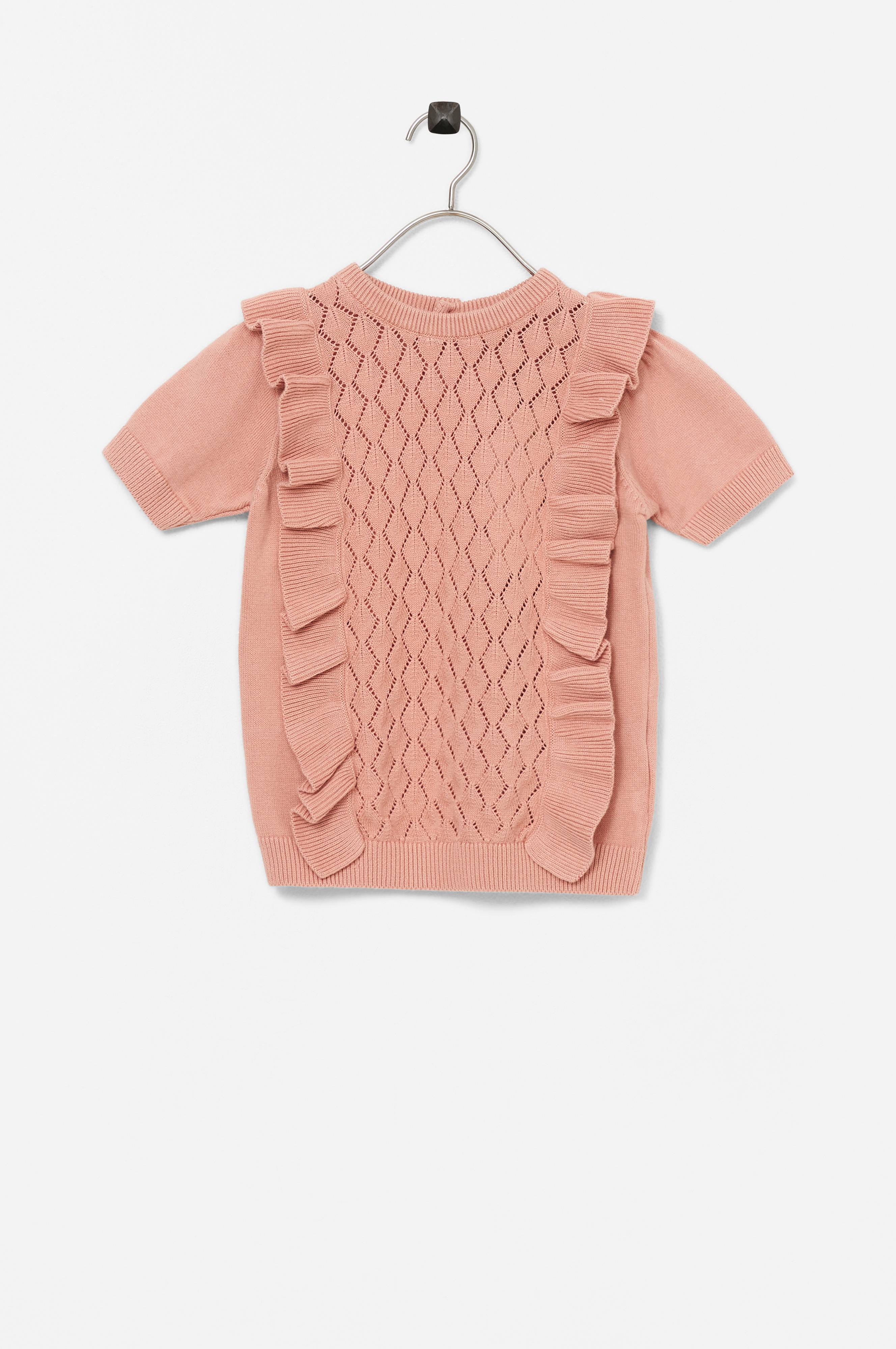 • Stickad tröja med korta ärmar • Volanger fram • Hålmönster fram • Slätstickad baksida • Knappar i nacken • Produkten är GOTS-certifierad, vilket innebär att den innehåller ekologiskt material som är odlat utan kemiska bekämpningsmedel, konstgödsel och genmodifierade grödor (GMO). Produkten uppfyller GOTS sociala och miljömässiga krav på ansvarsfull tillverkning från odling till slutprodukten. Den har mindre miljöpåverkan än konventionella material. Licensnummer & testinstitut: CERES 0366