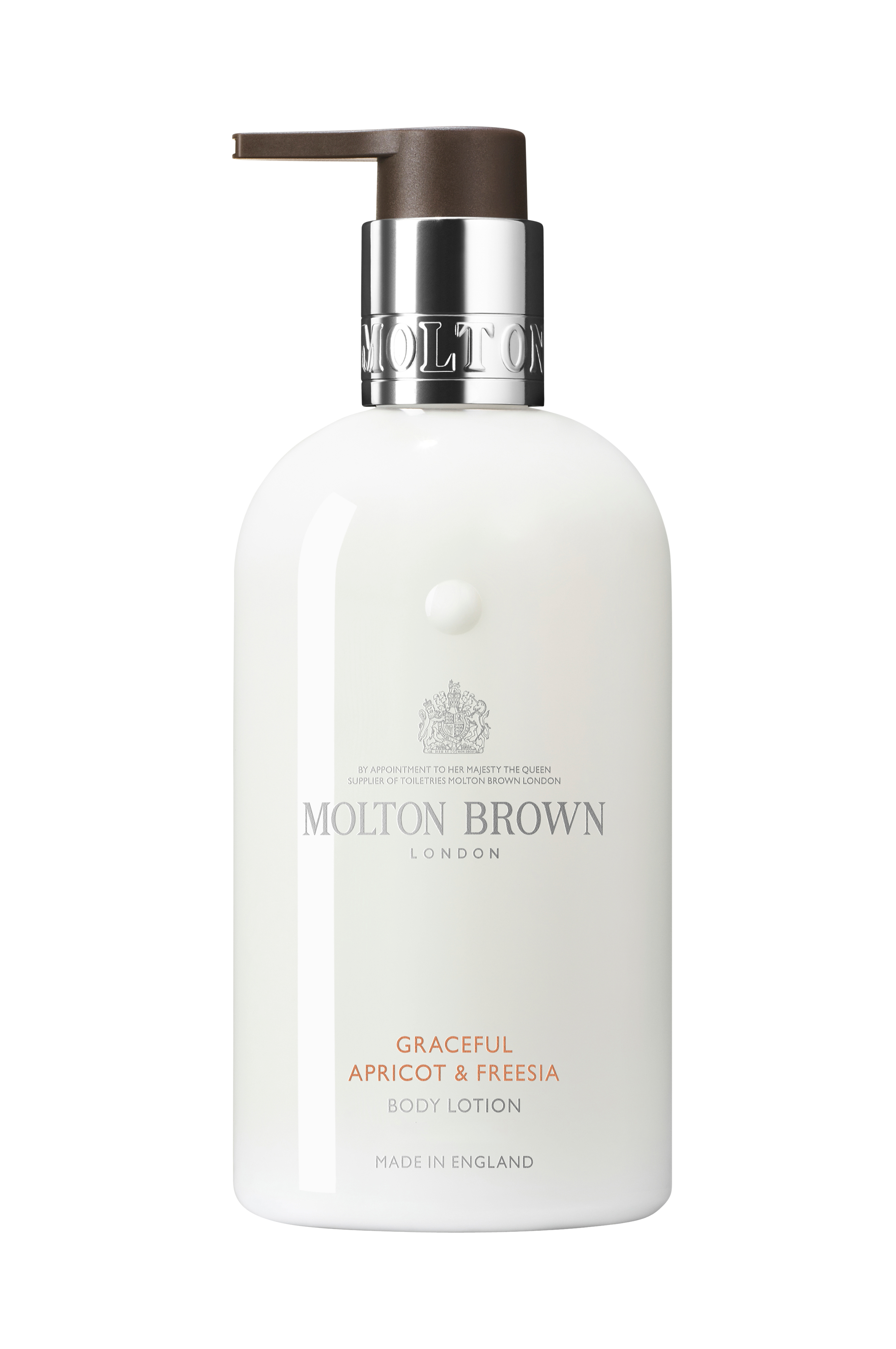 Molton Brown Graceful Apricot & Freesia Body Lotion är en återfuktande och vårdande bodylotion med en oemotståndlig blandning av söt och saftig aprikos, ljus mandarin, livlig freesia och mjuk mysk inspirerad av en engelsk fruktträdgård. Den är berikad med snabbabsorberande oljor för en sammetslen hud som inte känns kladdig - den perfekta lyxiga kroppsvården efter duschen. Kombinera med Molton Browns matchande Bath & Shower Gel för att förstärka den härliga, fruktigt blommiga doften.