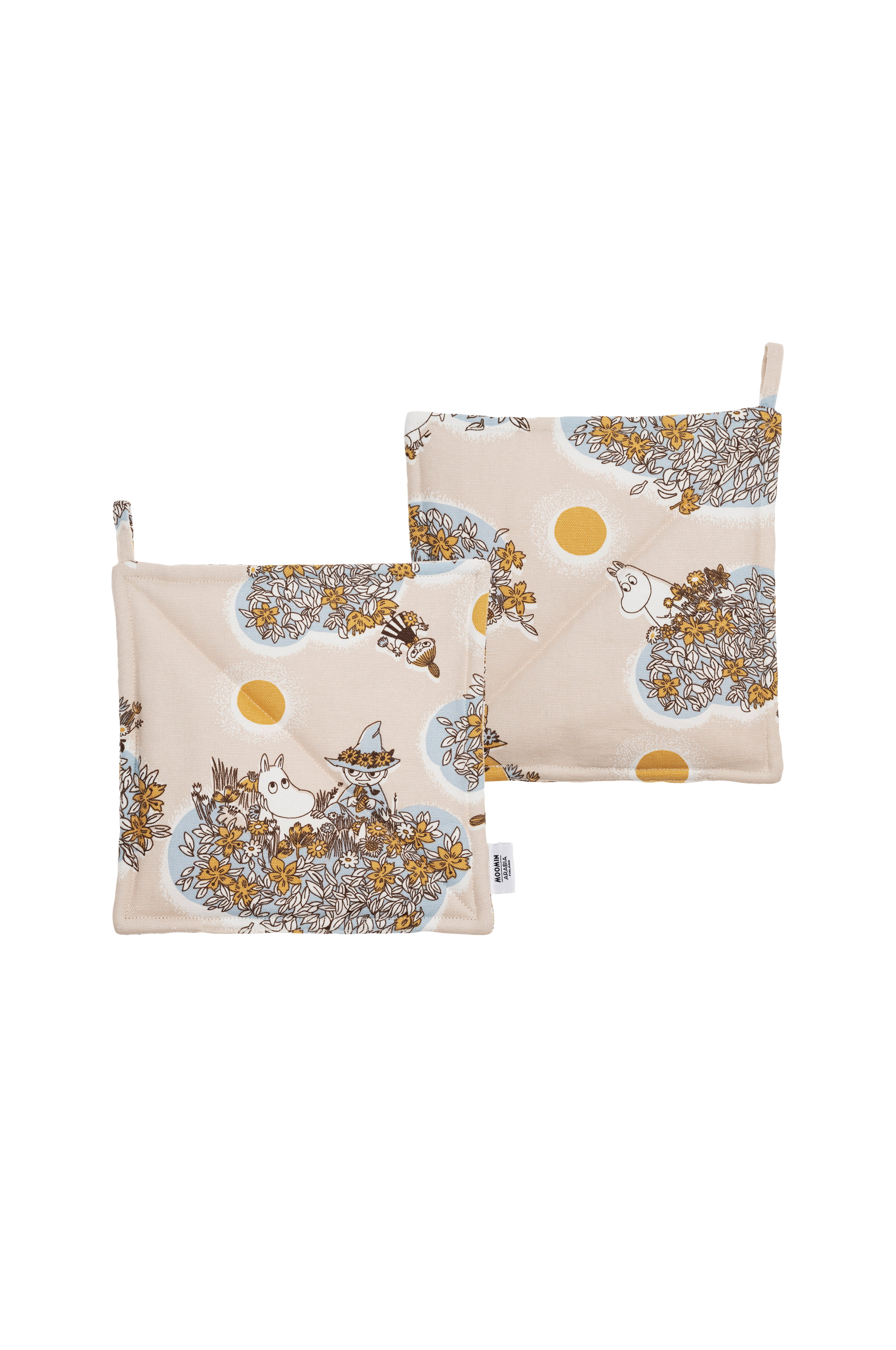 Bränn inte tassarna! Kökstextilierna "Vänner för alltid" med mjuka molnliknande former tillför en smula lekfullhet till de dagliga sysslorna. De är perfekta för alla äventyr i köket! Moomin Arabia grytlappar 22x22 cm, Vänner för alltid