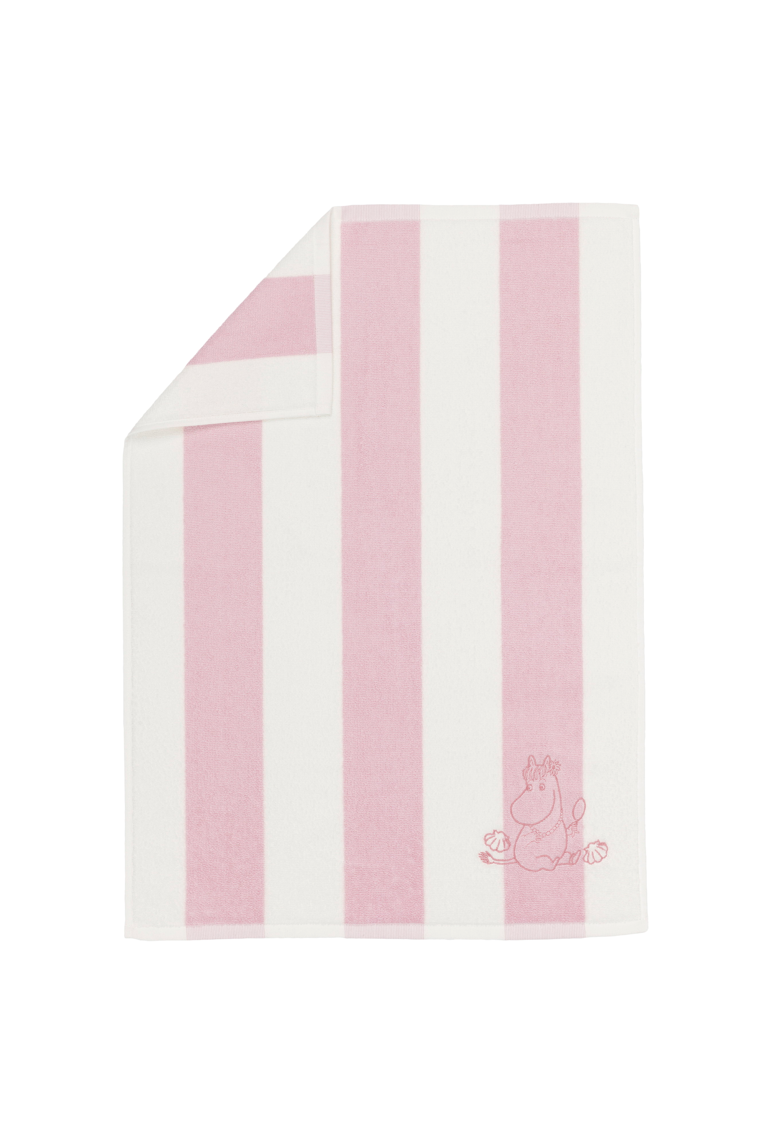 Njut av den mjuka och mysiga Mumin-handduken. De harmoniska tonerna av ljusrosa och vitt kompletterar det trendiga randiga mönstret. I det högra hörnet av handduken tittar Snorkfröken på snäckskal, hennes favoritskatter från havet. Moomin Arabia handduk 50x70cm cm, Snäckskal rand