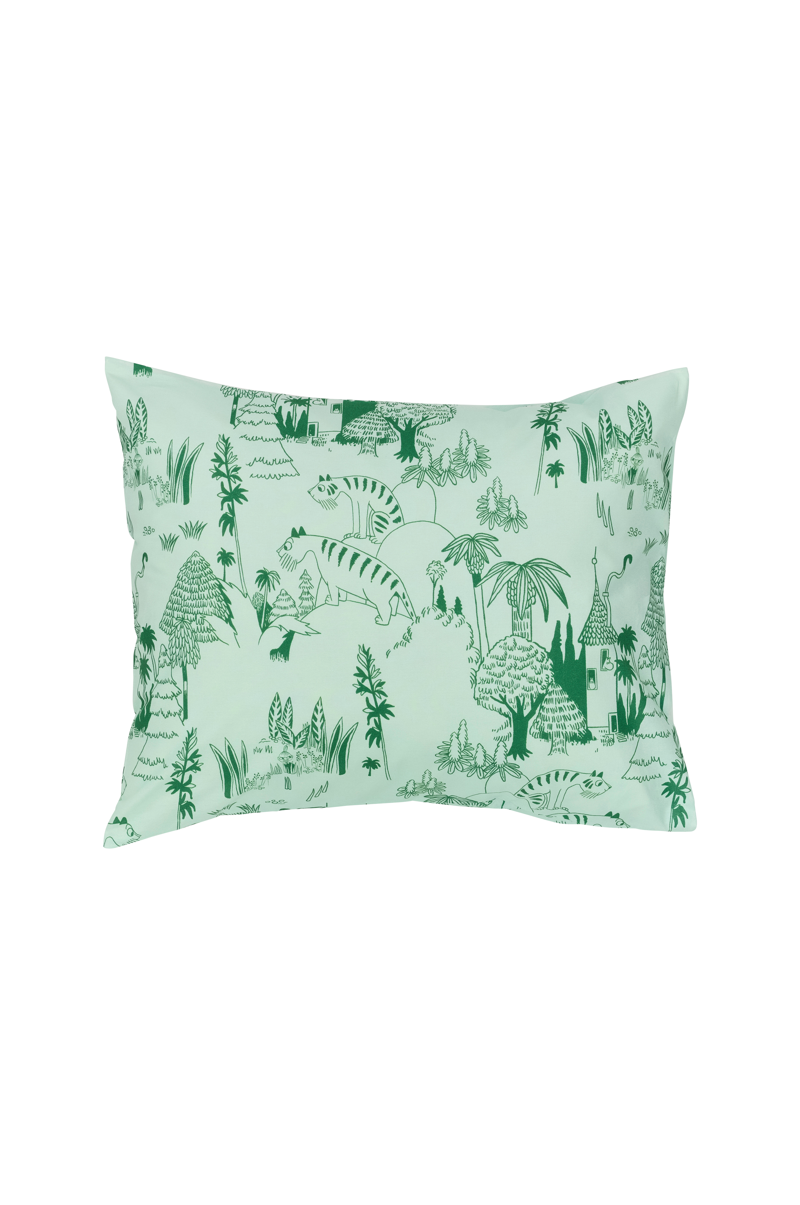 Vågar du sova med tigrarna? Muminmamman planterar exotiska frön som förvandlar hela Mumindalen till en djungel. För att få till en riktig djungelkänsla släpper Stinky lös alla djuren från djurparken. Den täta djungeln får tigrarna att känna sig som hemma. Mumin örngott 50x60 Trädgårdsfest, ekologisk bomull.