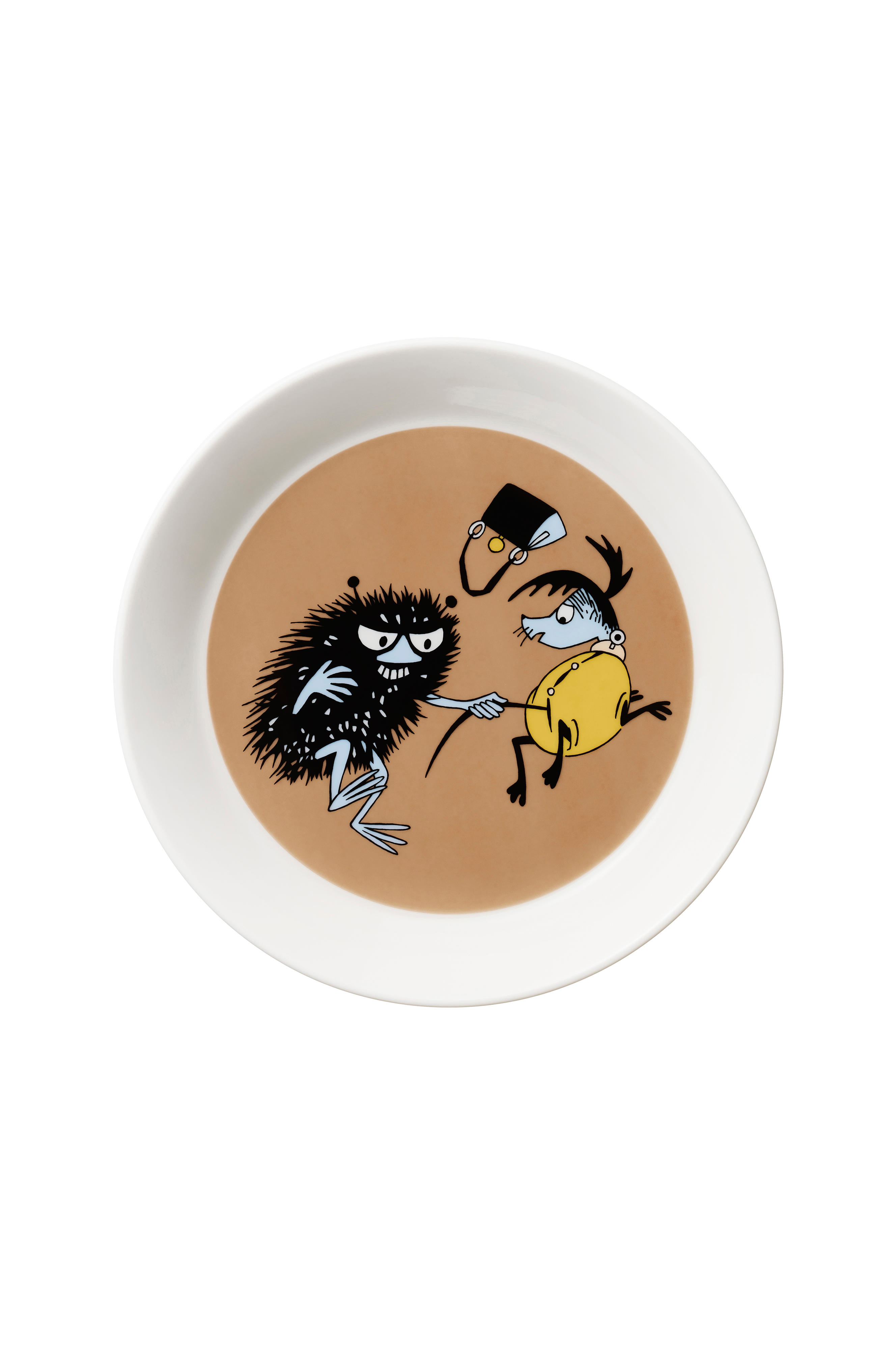 Stinky är skurken i Mumindalen, men en mycket trevlig sådan. Det springer omkring en lekfull hund i Mumindalen som har stulit Muminmammans väska. Stinky får tag i hundens svans och hunden släpper taget om väskan. Muminmamman får tillbaka sin väska. Moomin Arabia tallrik 19cm, Stinky i aktion.