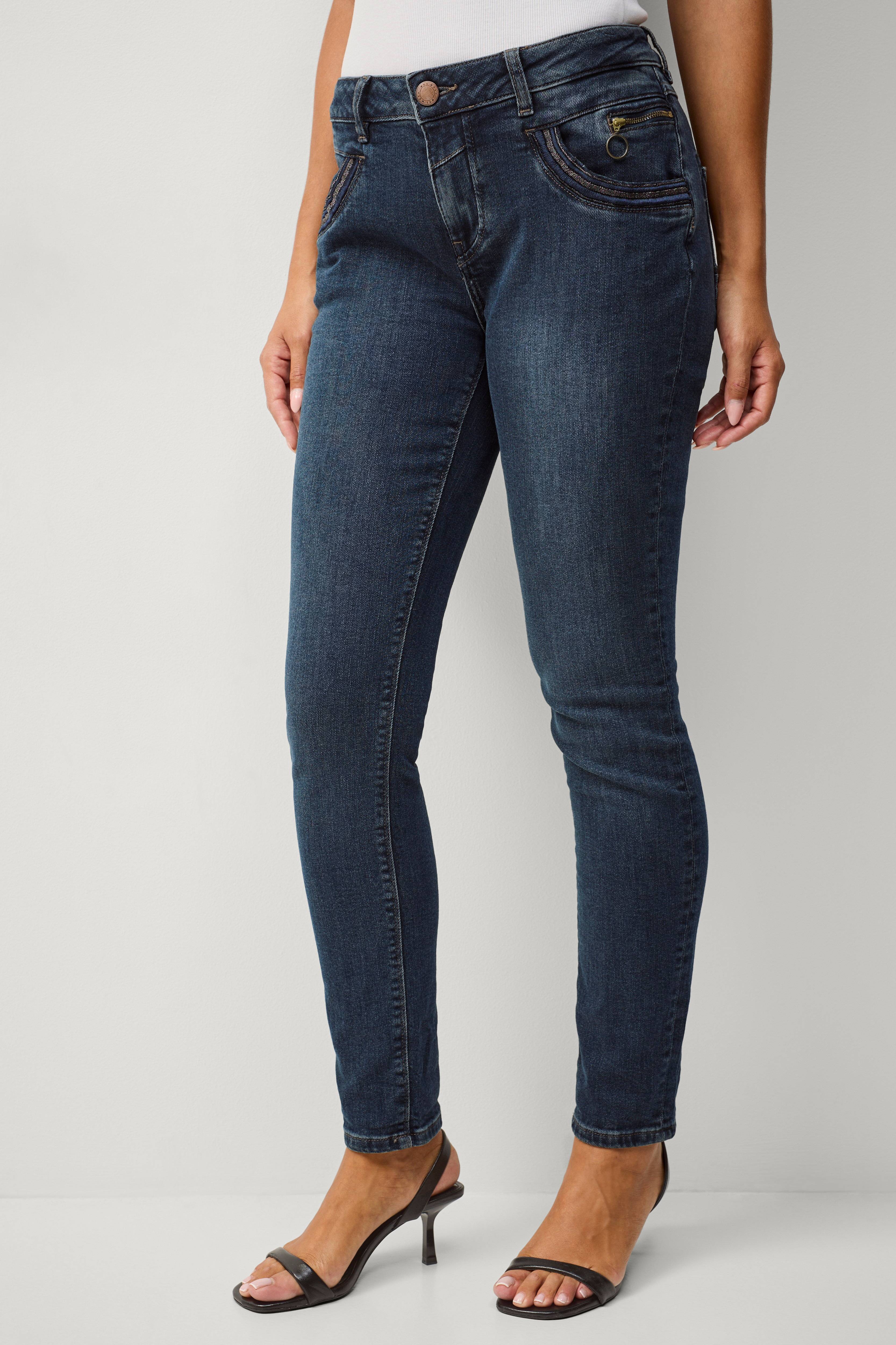 • Stretchdenim• Två fickor fram• En myntficka fram med dragkedja• Två bakfickor• Dekorativa detaljer med metalliska broderier på framfickorna• Dragkedjegylf