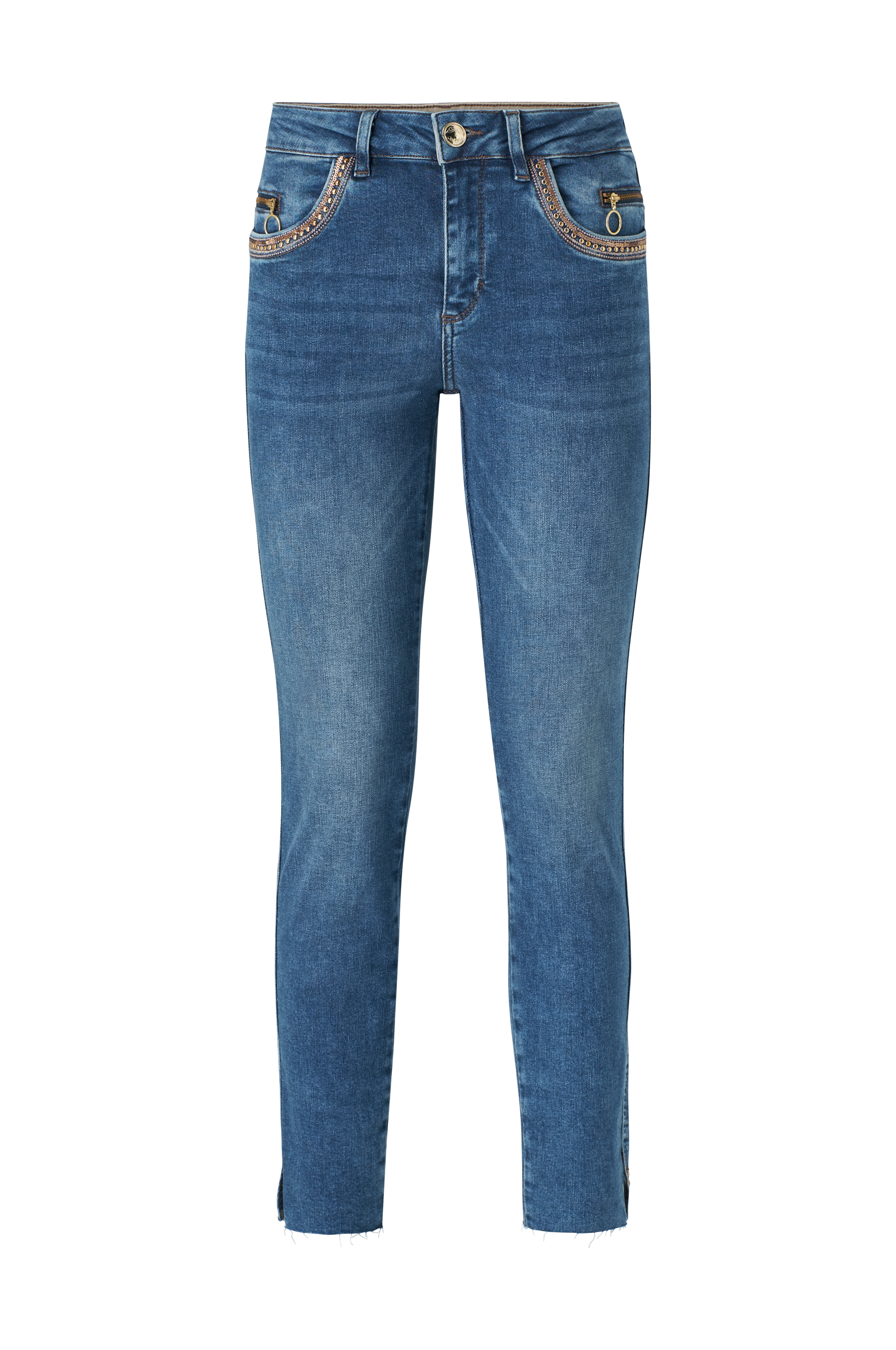 • Ankellängd• Låg midja• Smal passform• Två fickor fram med dekorativa nitar och paljetter• Två fickor med dragkedja• Två bakfickor med nitdetaljer• Gylf med dragkedja• Stretchdenim