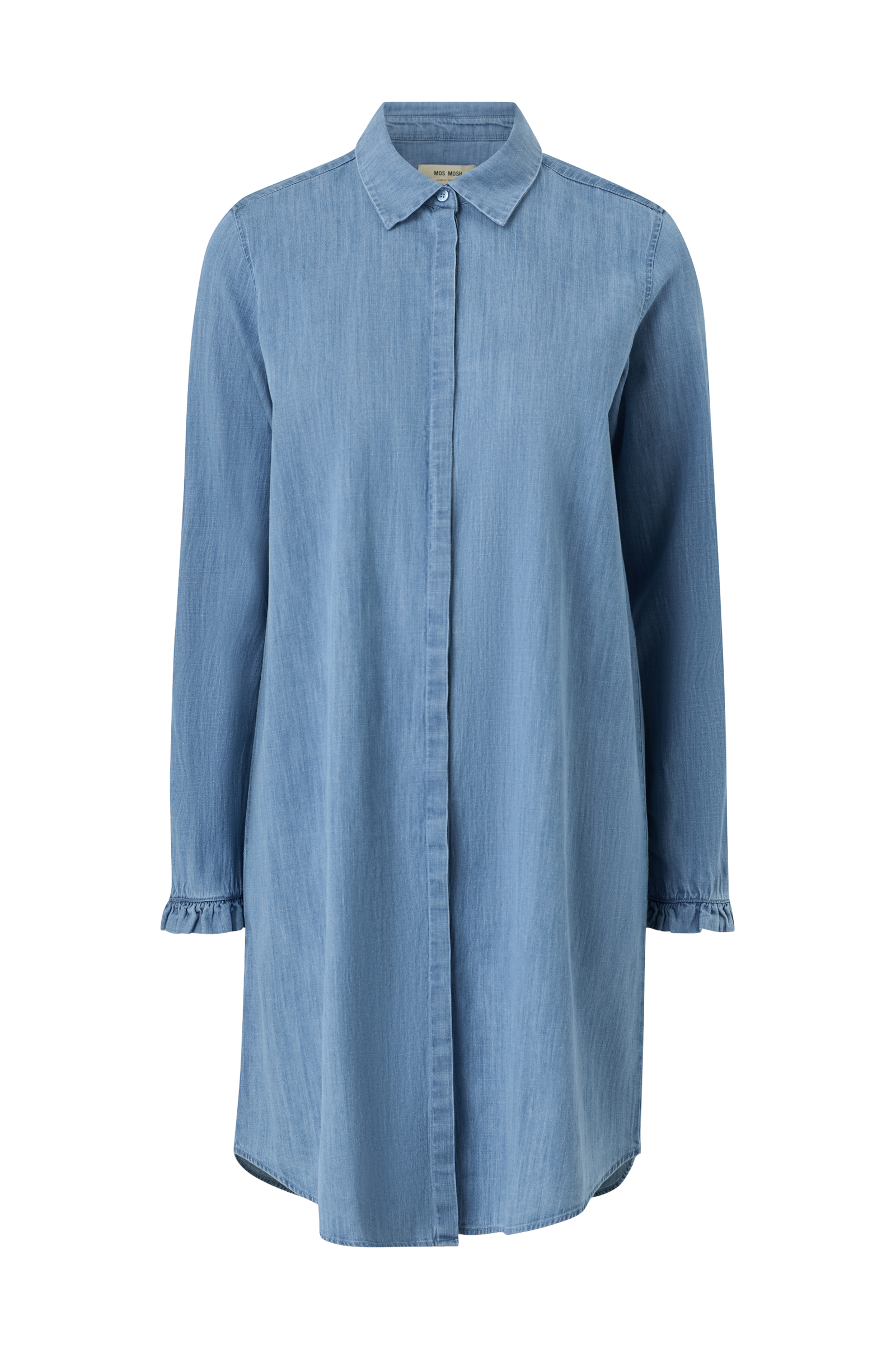 • Jeansklänning med krage• Rak modell• Dold knappslå hela vägen fram• Långa ärmar med volanger i ärmsluten• Rundad nederkant• Längd: 95 cm i storlek S