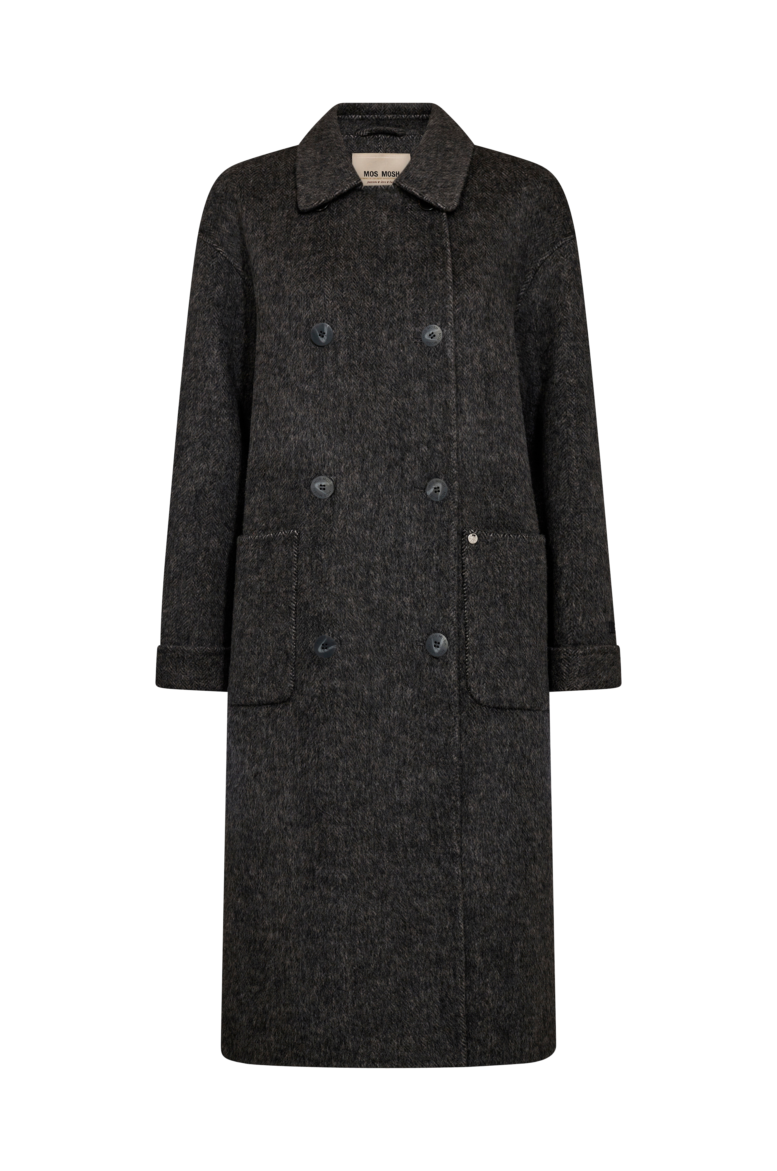 • Lång, mönstrad kappa i ullblandning• Krage• Dubbelknäppt modell• Uppsydda ärmslut• Två öppna fickor fram• Slits nedtill bak• Längd: 106 cm i storlek S