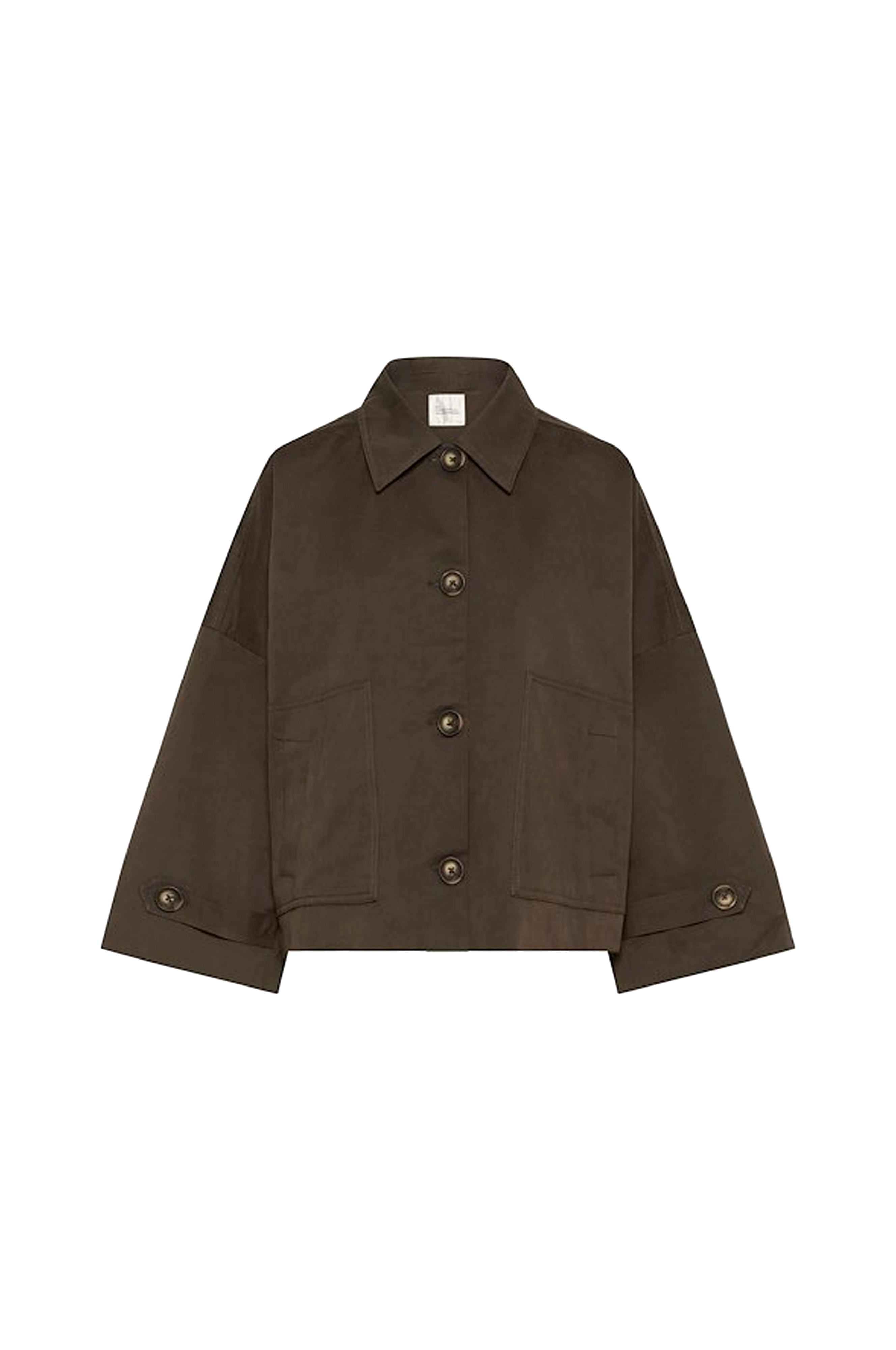 • Kort jacka med krage• Vid passform• Knappstängning• Sidfickor• Justerbara slejfar i ärmsluten• Vävt, slätt innerfoder• Längd: 62 cm i storlek 28/40