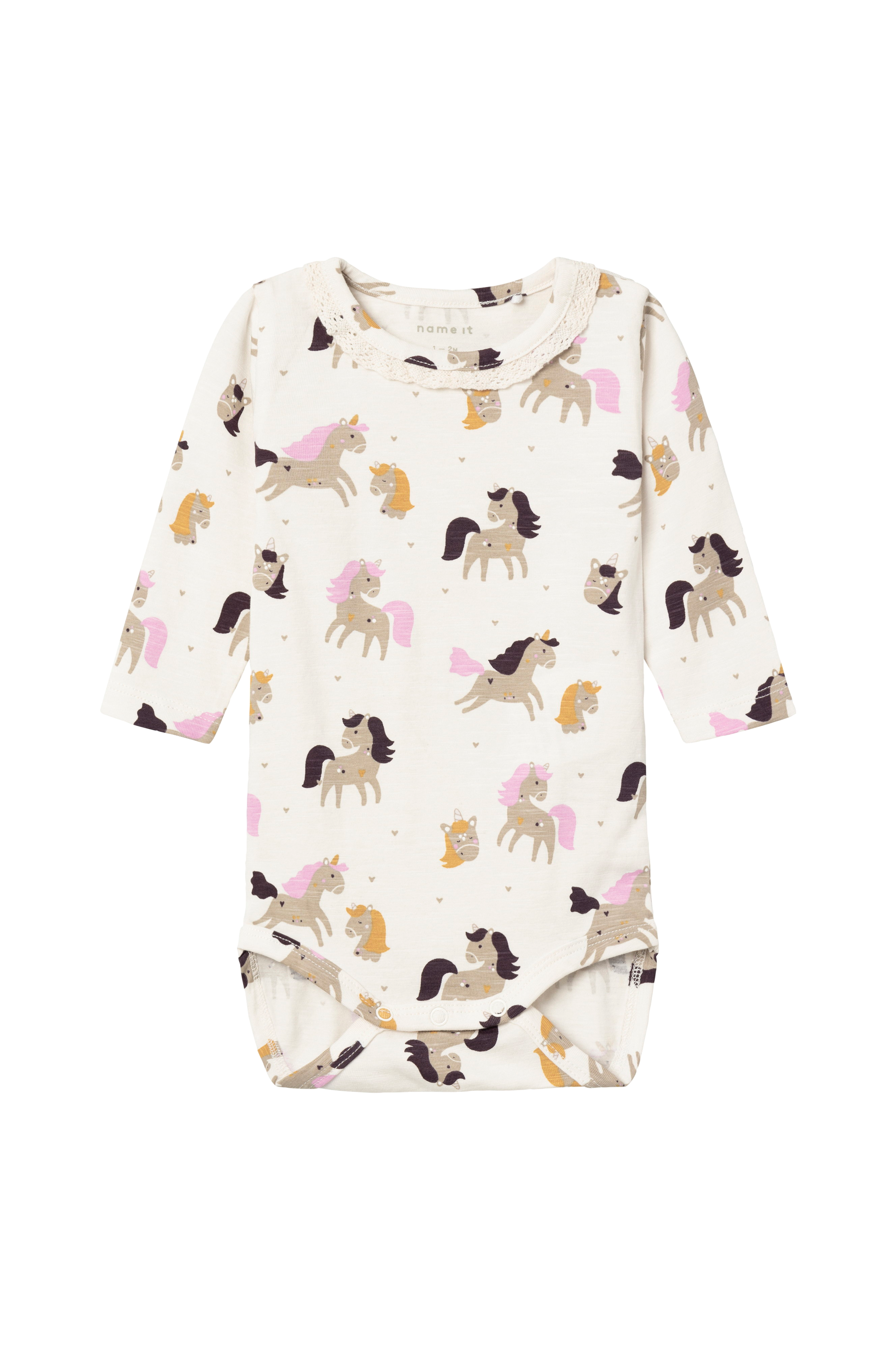 • Långärmad modell• Rund hals med spetskant• Tryckknappar på ena axeln och i grenen