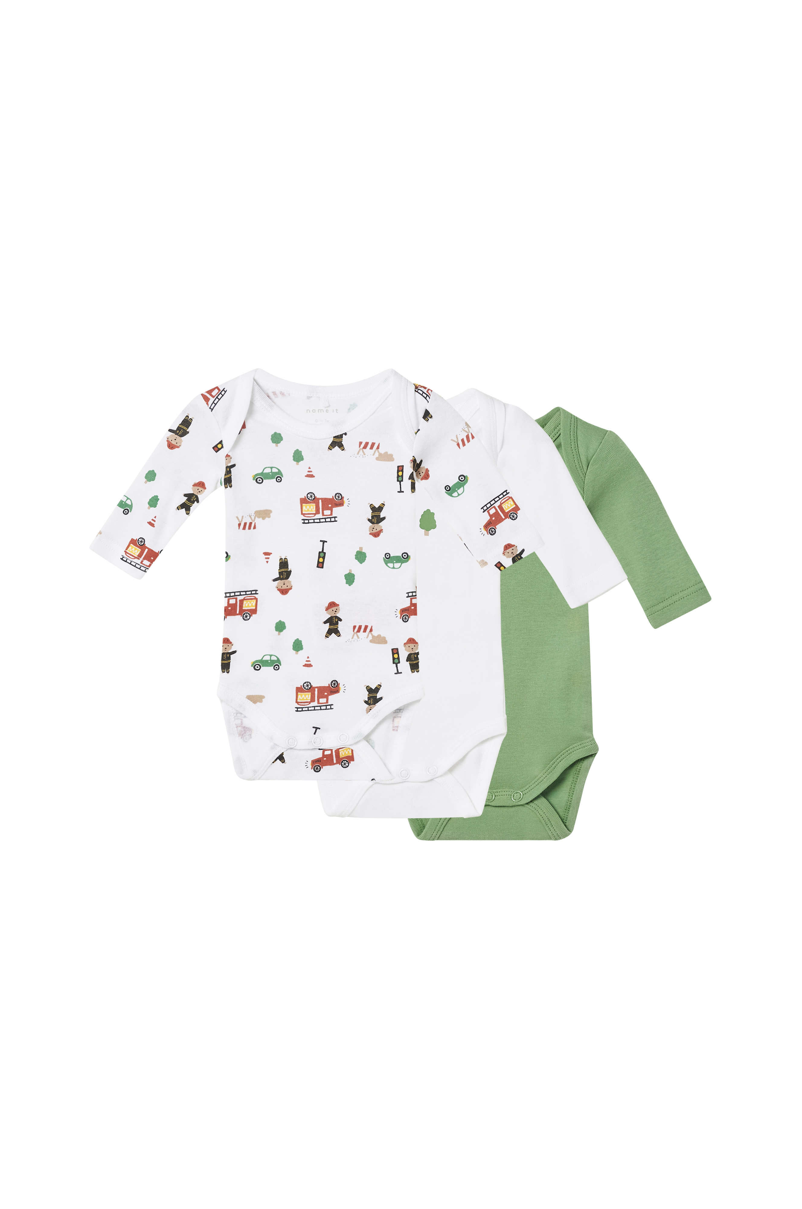 Body i 3-pack med olika färger och mönster. Rund halsringning och omlottlagda axlar. Tryckknappar i grenen.