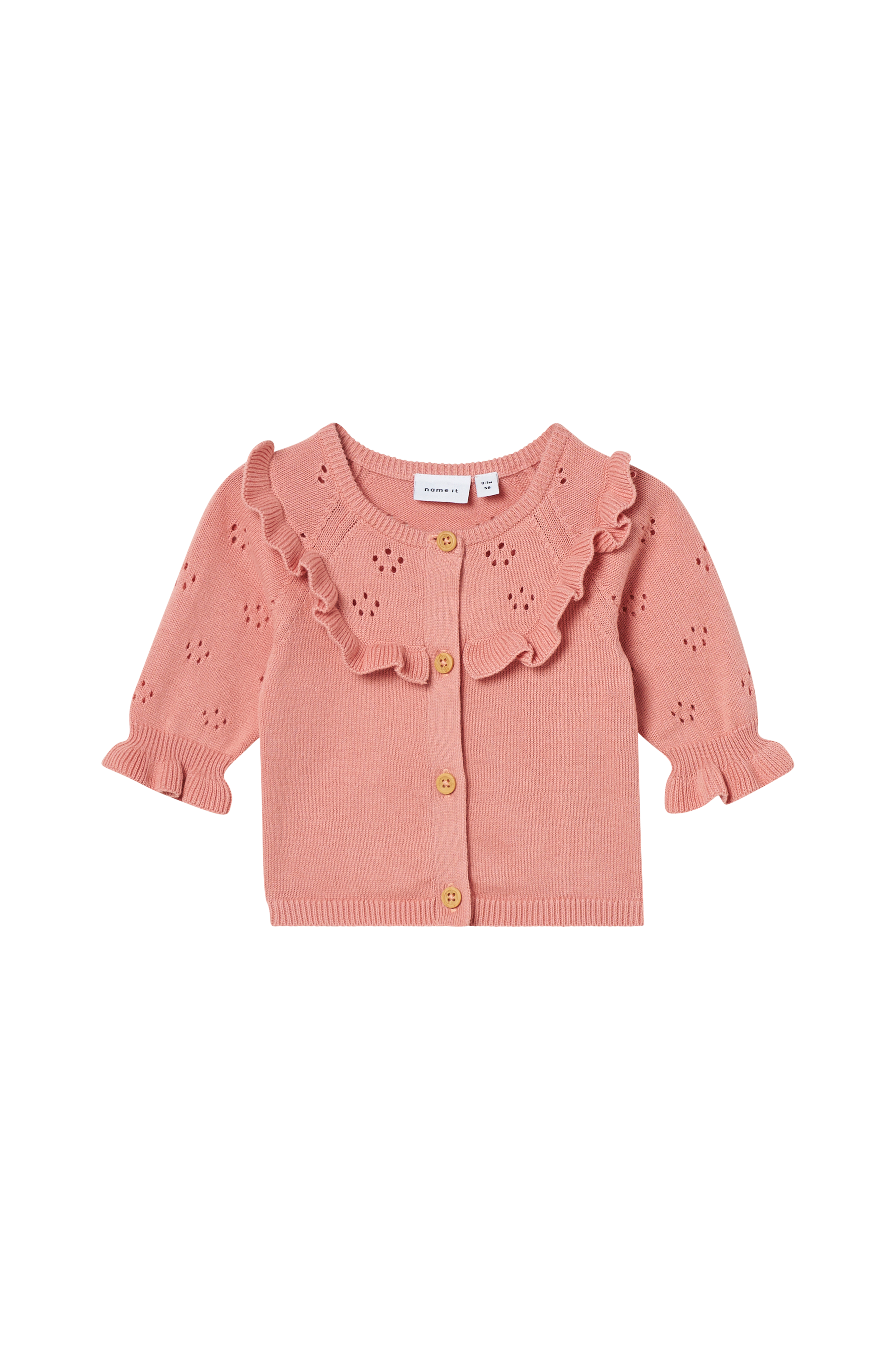 • Finstickad cardigan i bomull • Hålmönster upptill och runt om • Påsydd volangkant framtill • Ribbade kanter i ärmsluten och nedtill • Produkten innehåller ekologisk bomull som är odlad utan kemiska bekämpningsmedel, konstgödsel och genmodifierade grödor (GMO). Det innebär en mer hälsosam arbetsmiljö för bönder och bättre jordmån.