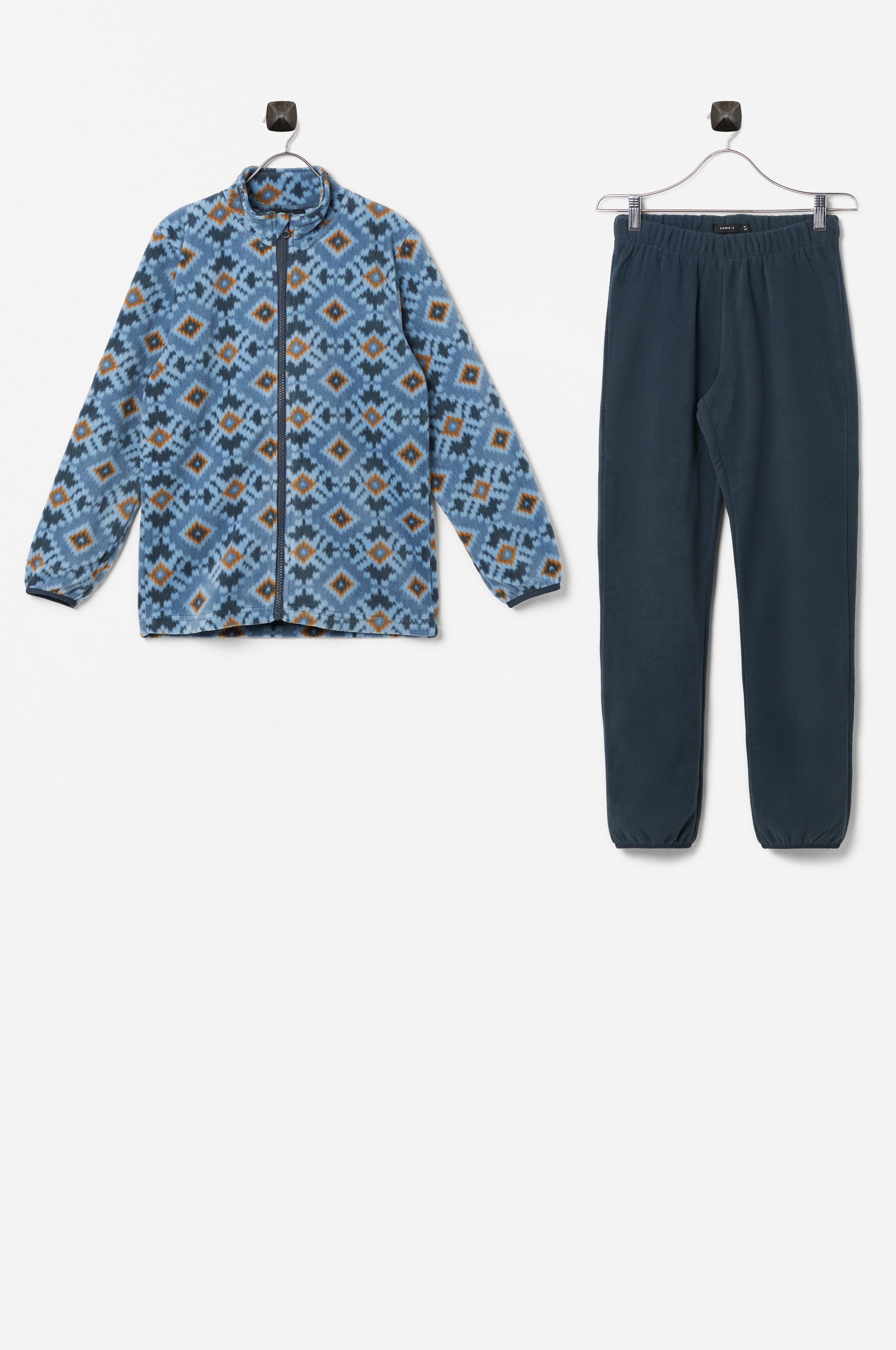 Set i mjuk, snabbtorkande fleece. Mönstrad jacka med dragkedja och elastiska kanter i ärmsluten. Byxorna har elastisk midja med invändig dragsko. Elastiska kanter i bensluten.
