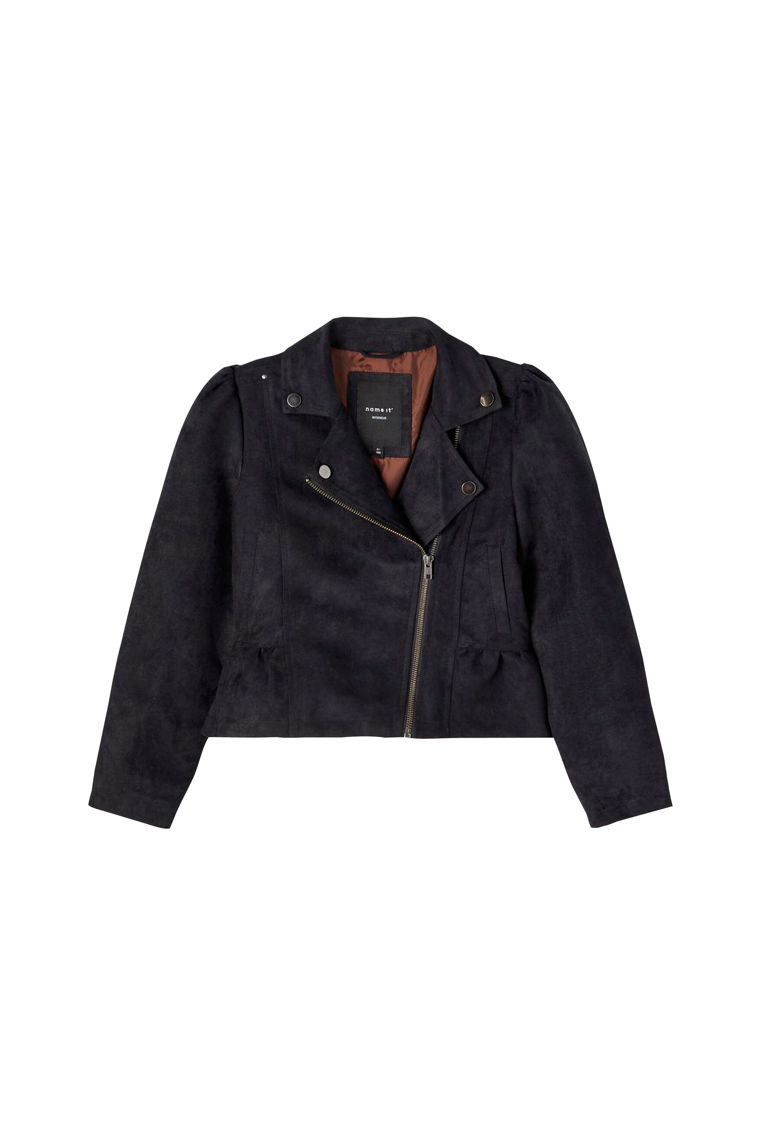 Jacka i mockaimitation med förskjuten dragkedja. Två fickor och ärmar med liten puff. Dekorativa knappar på kragen och rynkeffekter nedtill i sidorna.