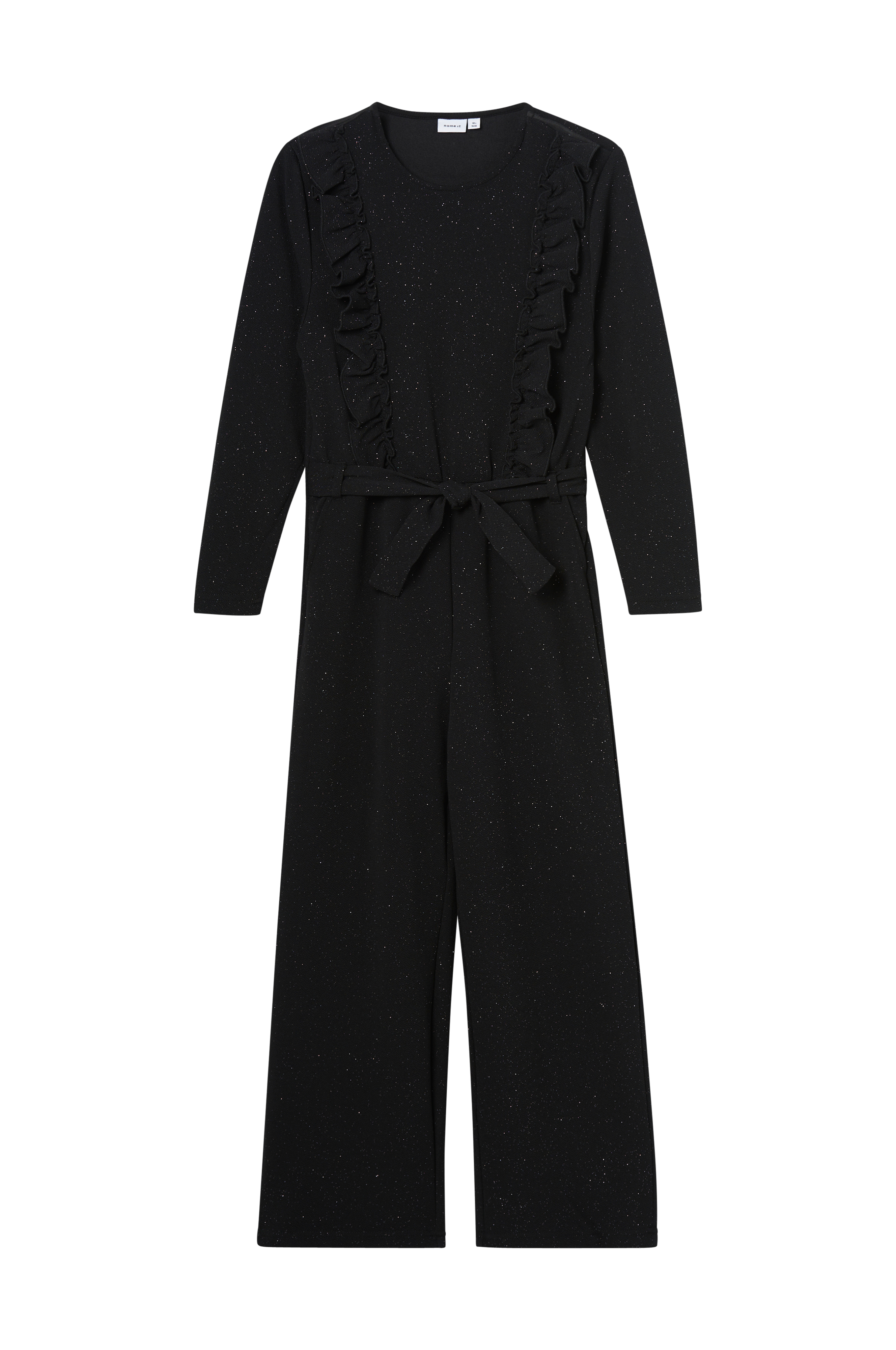 • Glittrig jumpsuit• Volanger fram• Fickor i sidorna• Vida ben• Knytband fram i midjan