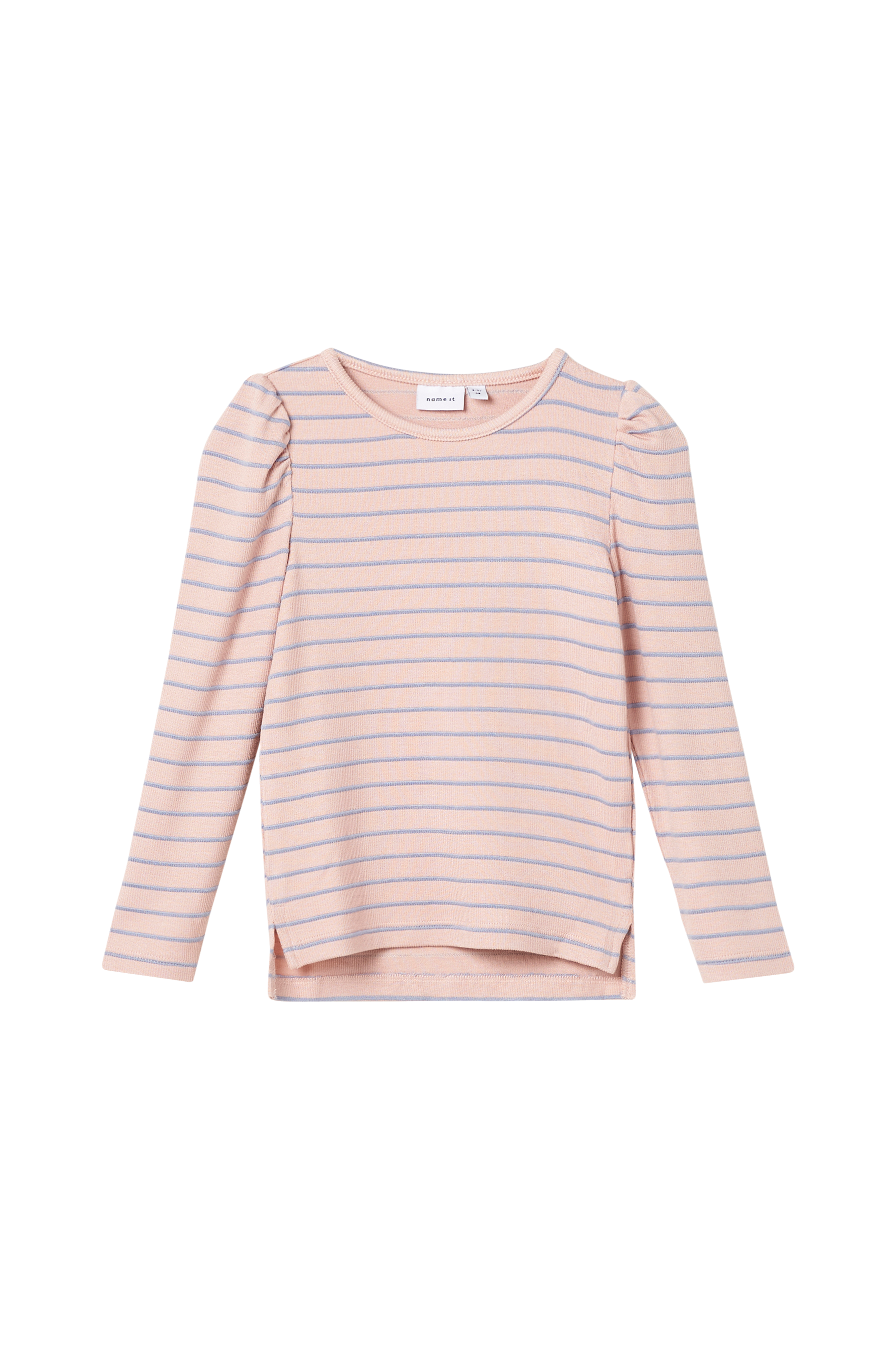 Topp i ribbad viskostrikå med stretch. Lång puffärm och rund halsringning. Sprund nedtill i sidorna. Något längre baktill.