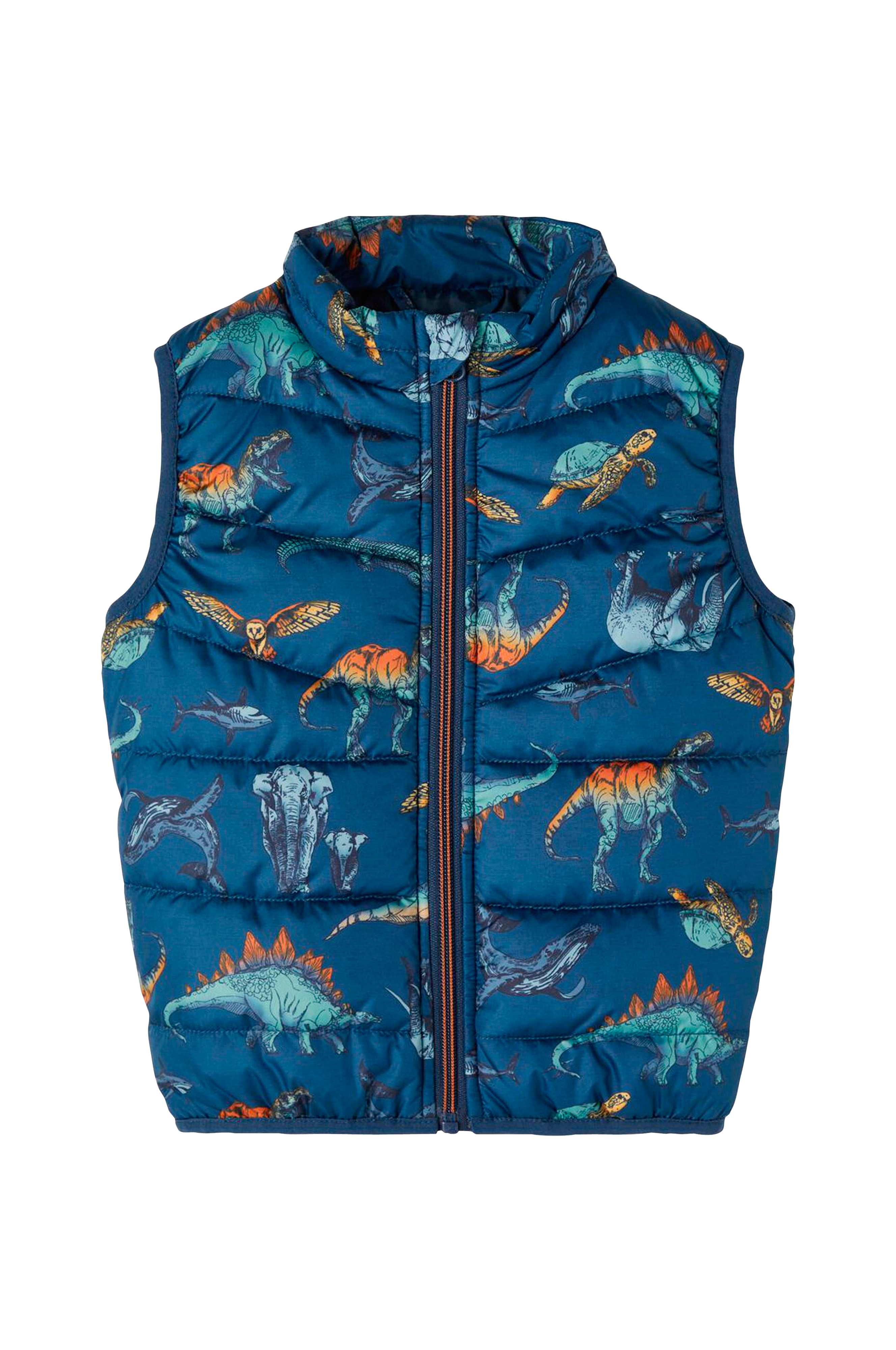 Quiltad och vadderad väst med hög krage och dragkedja. Elastiska bandkanter runt ärmöppningarna och i nederkanten.