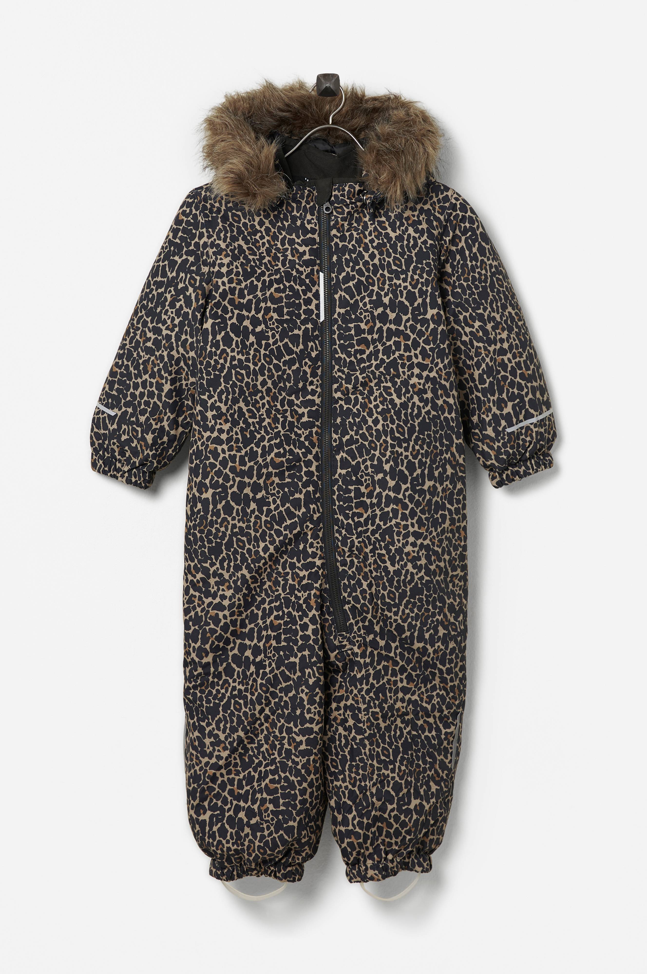 Avknäppbar huva med avtagbar fuskpälskant. Hög krage med mjuk, borstad trikå på insidan. Stängning med dragkedja. Resår i midjan bak. Resår i ärmslut och benslut. Elastiska, avtagbara fothällor. Reflexdetaljer runt om.