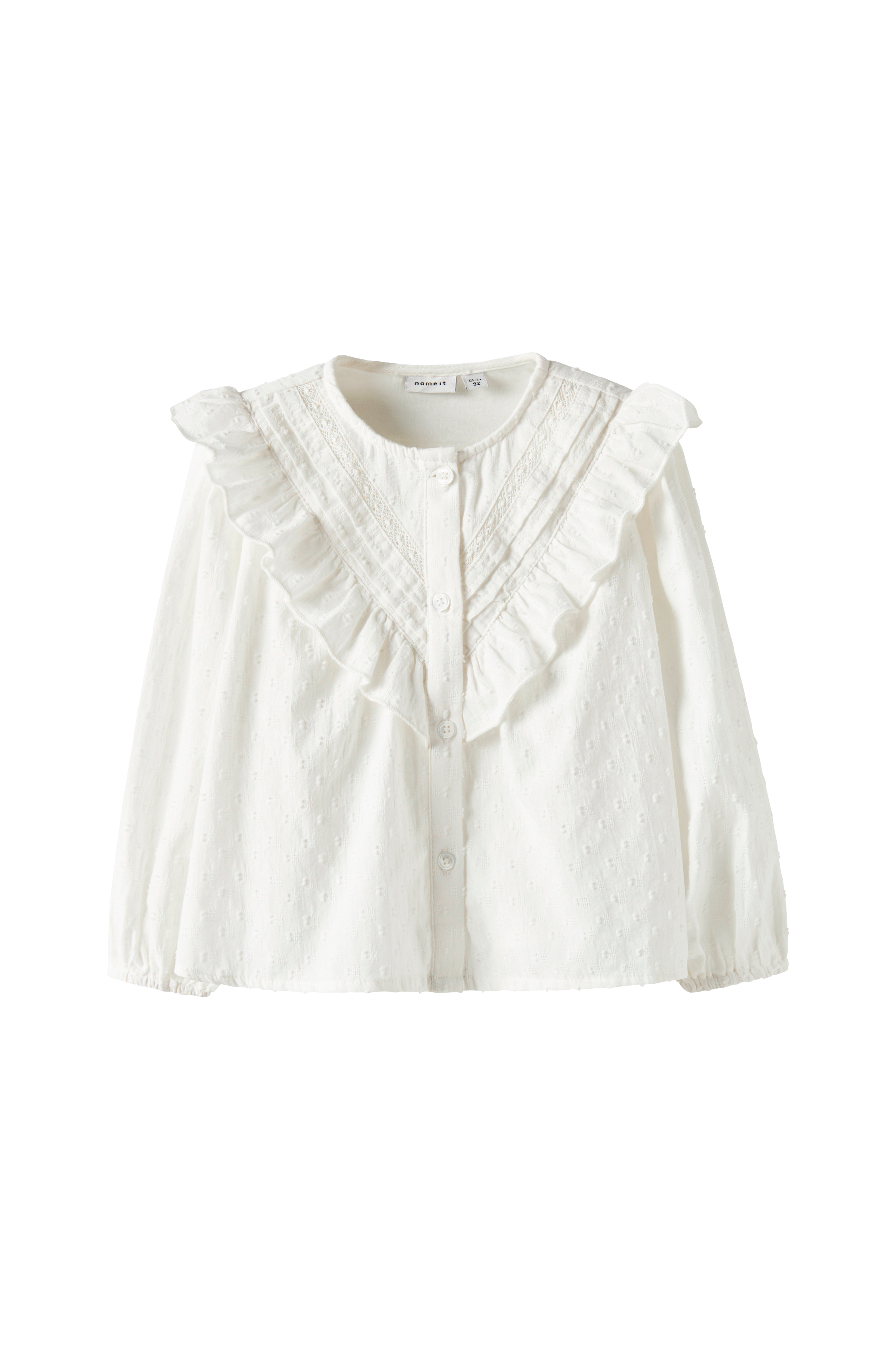 • Blus i bomull med broderad struktur• Rund halsringning• Volang framtill och över axlarna• Knappar hela vägen fram• Långa puffärmar med elastiska ärmslut