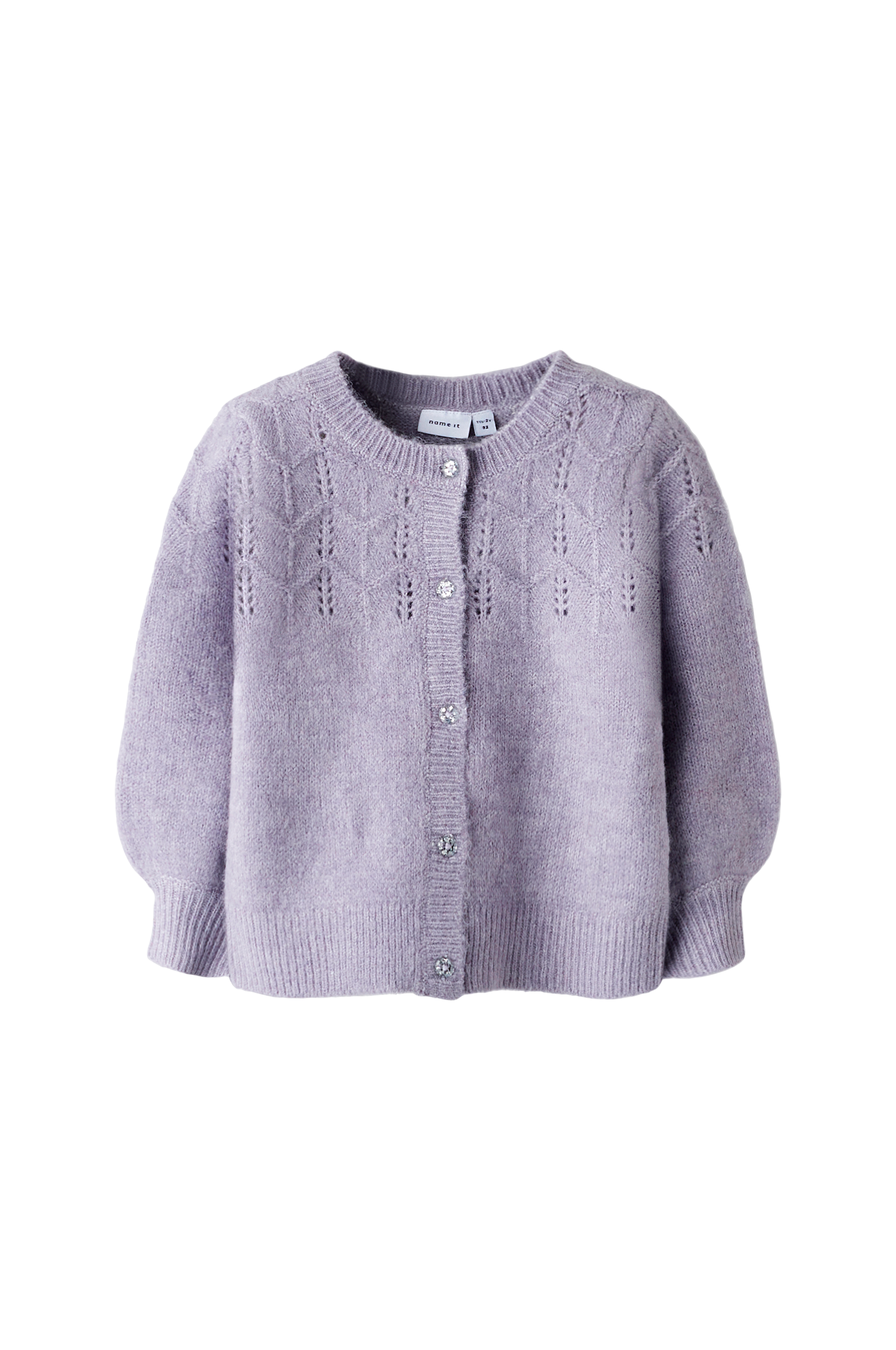 • Finstickad cardigan med långa ärmar• Rund, ribbad halsringning• Mönsterstickning upptill fram• Knappstängning• Ribbstickning i ärmsluten och i nederkanten