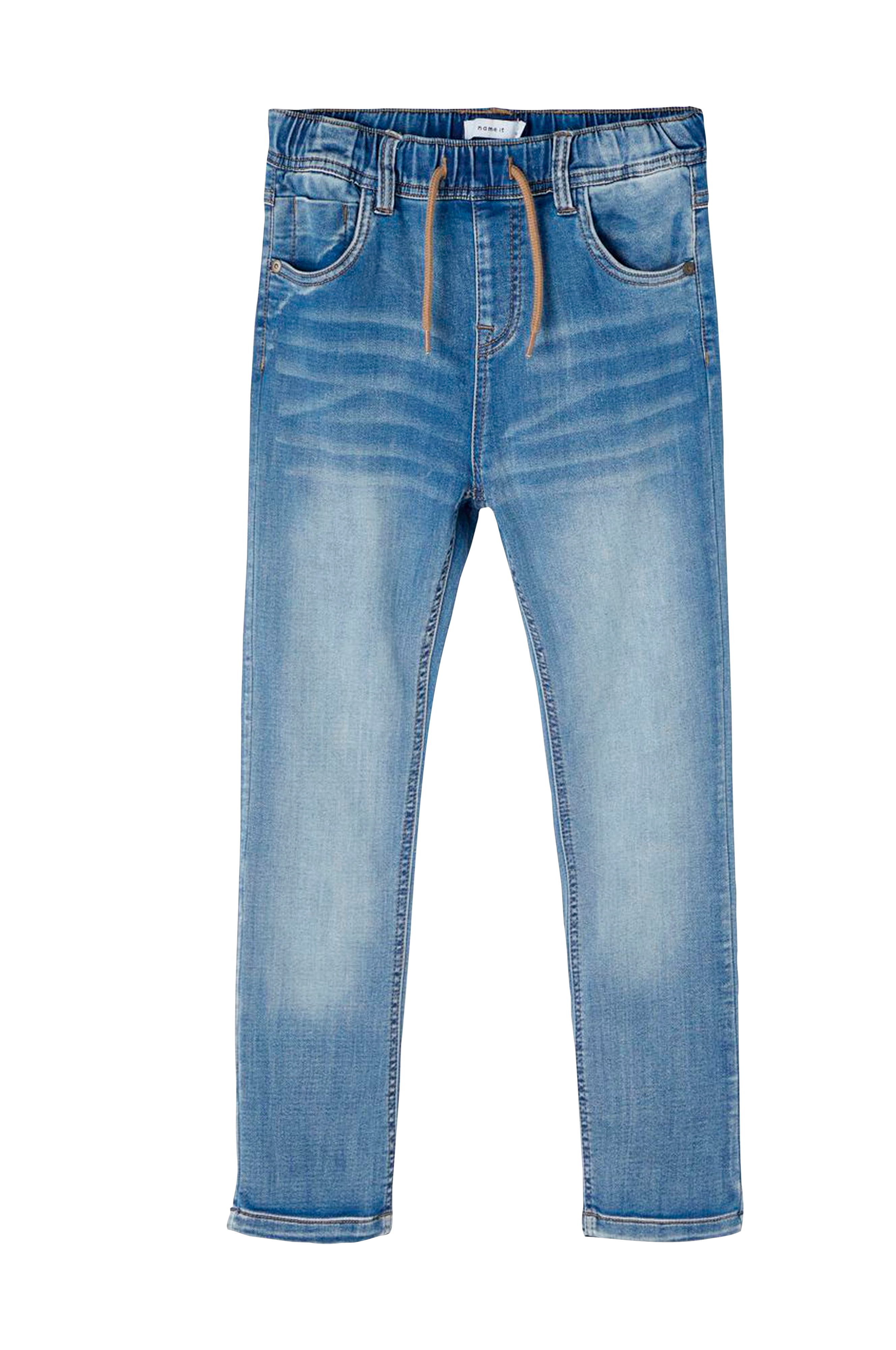 Jeans i denimliknande sweattrikå med power stretch. Normalhög midja och smala ben. Reglerbar midja med dragsko. Femficksmodell.