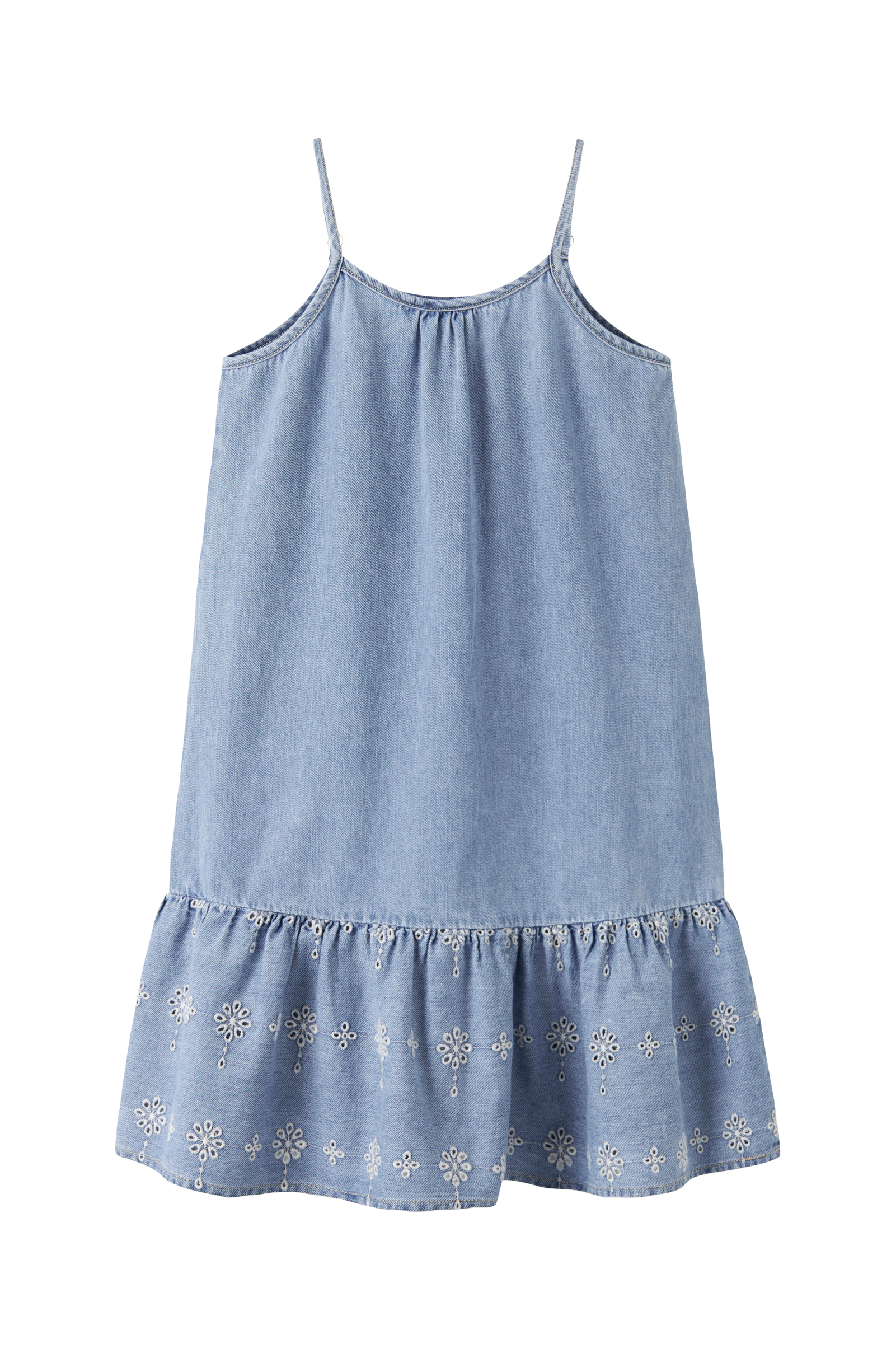 • Ärmlös klänning i denim• Justerbara axelband• Volang i nederkanten med hålbroderi