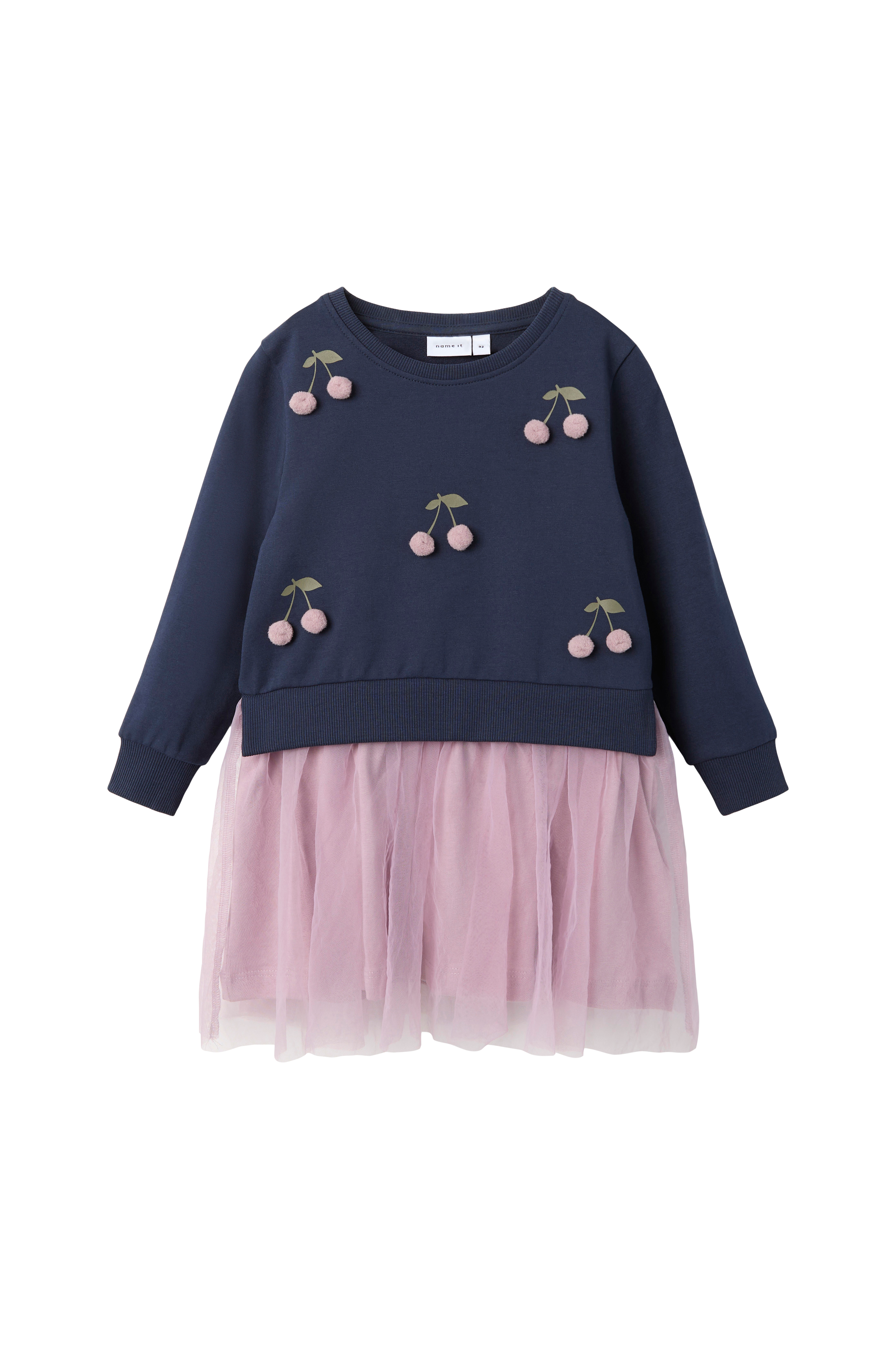 • Klänning med överdel i sweatshirttyg• Rund halsringning• Påsydda, dekorativa bär i fuskpäls fram• Ribbmuddar i ärmsluten och i nederkanten• Kjol i mesh med stretchigt foder