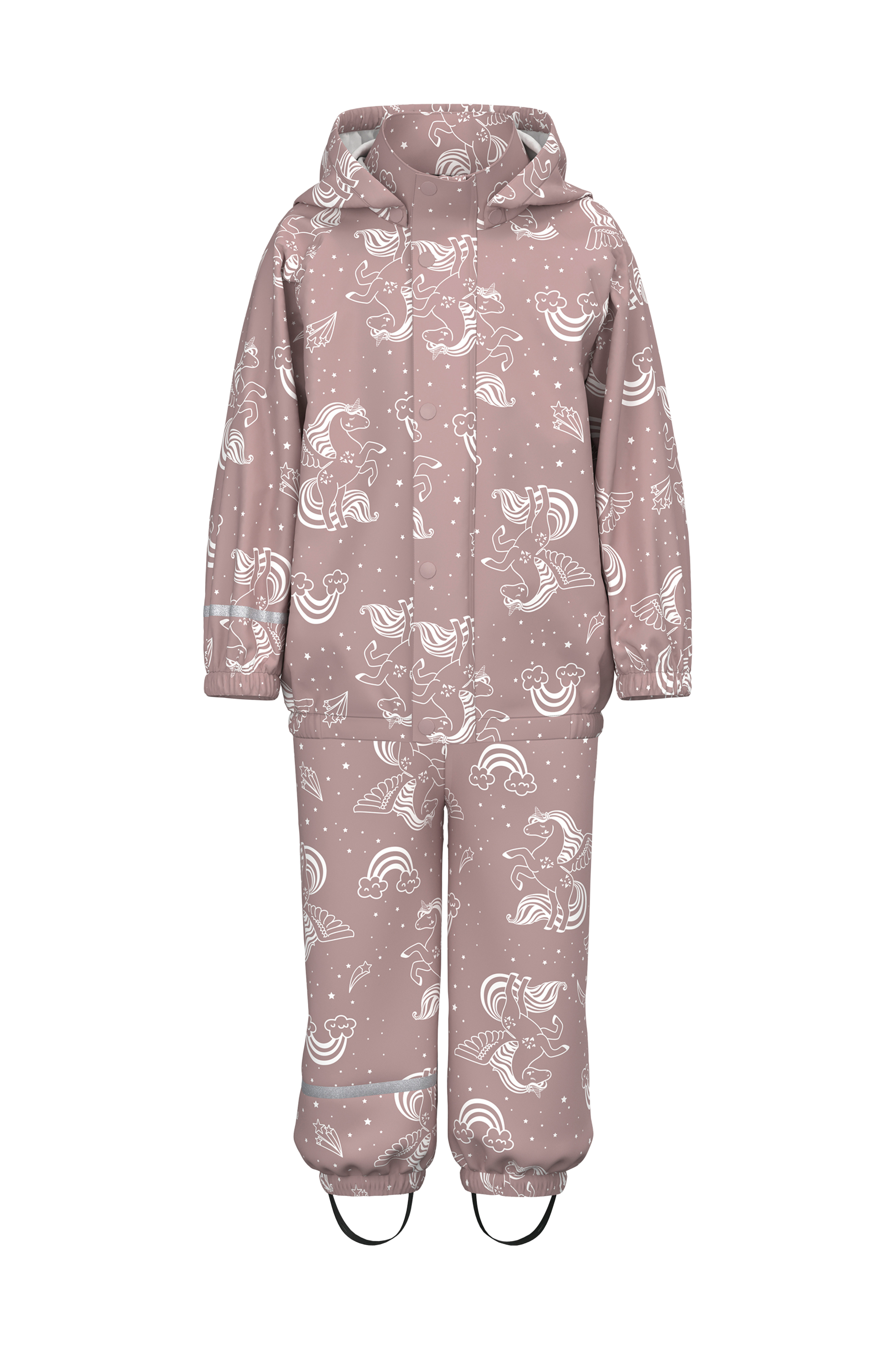 • Ovadderat, vattentätt regnset med jacka och byxor • Gjort av polyester med PU-beläggning • Förseglade sömmar • Jacka med avtagbar huva • Dragkedja • Vindslå över dragkedjan med tryckknappar • Resår i ärmsluten och i nederkanten • Byxor med justerbara, elastiska hängslen • Resår i bensluten • Avtagbara, elastiska fothällor • Reflexdetaljer